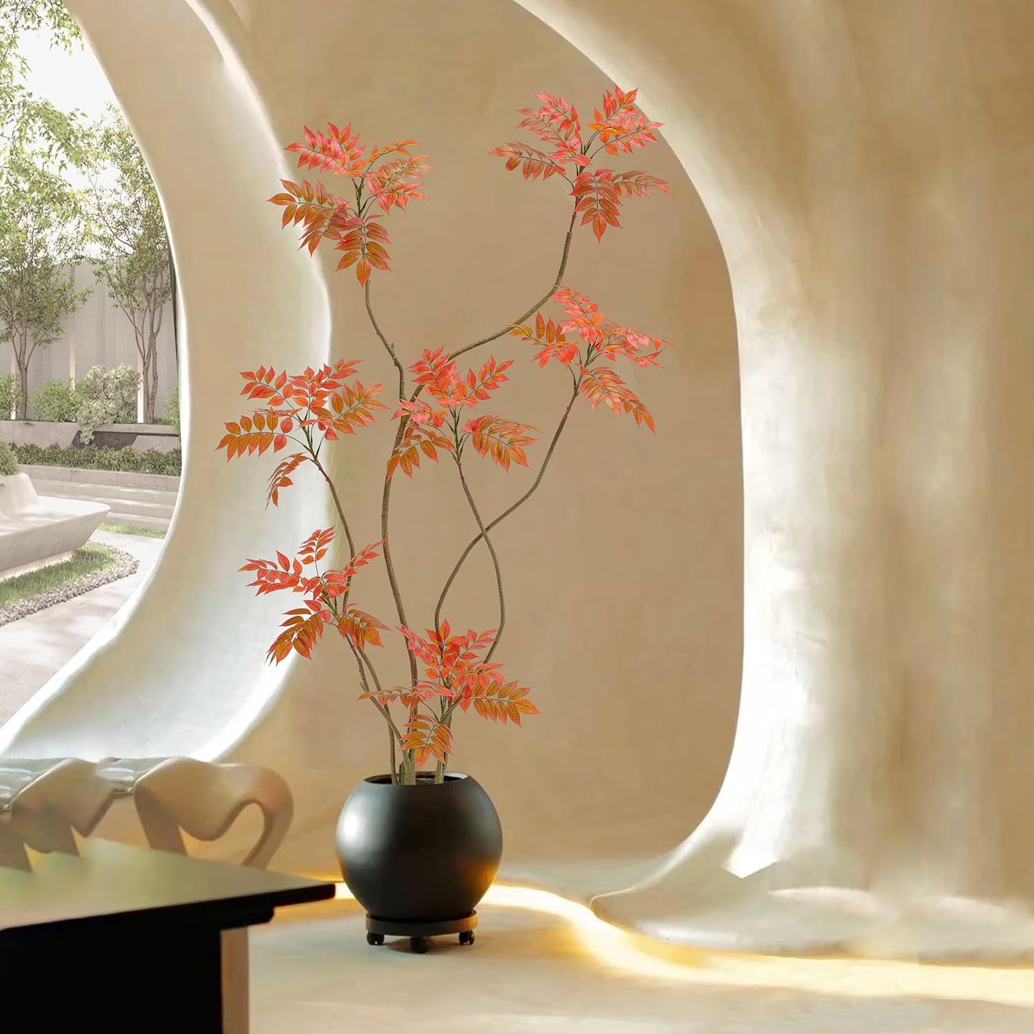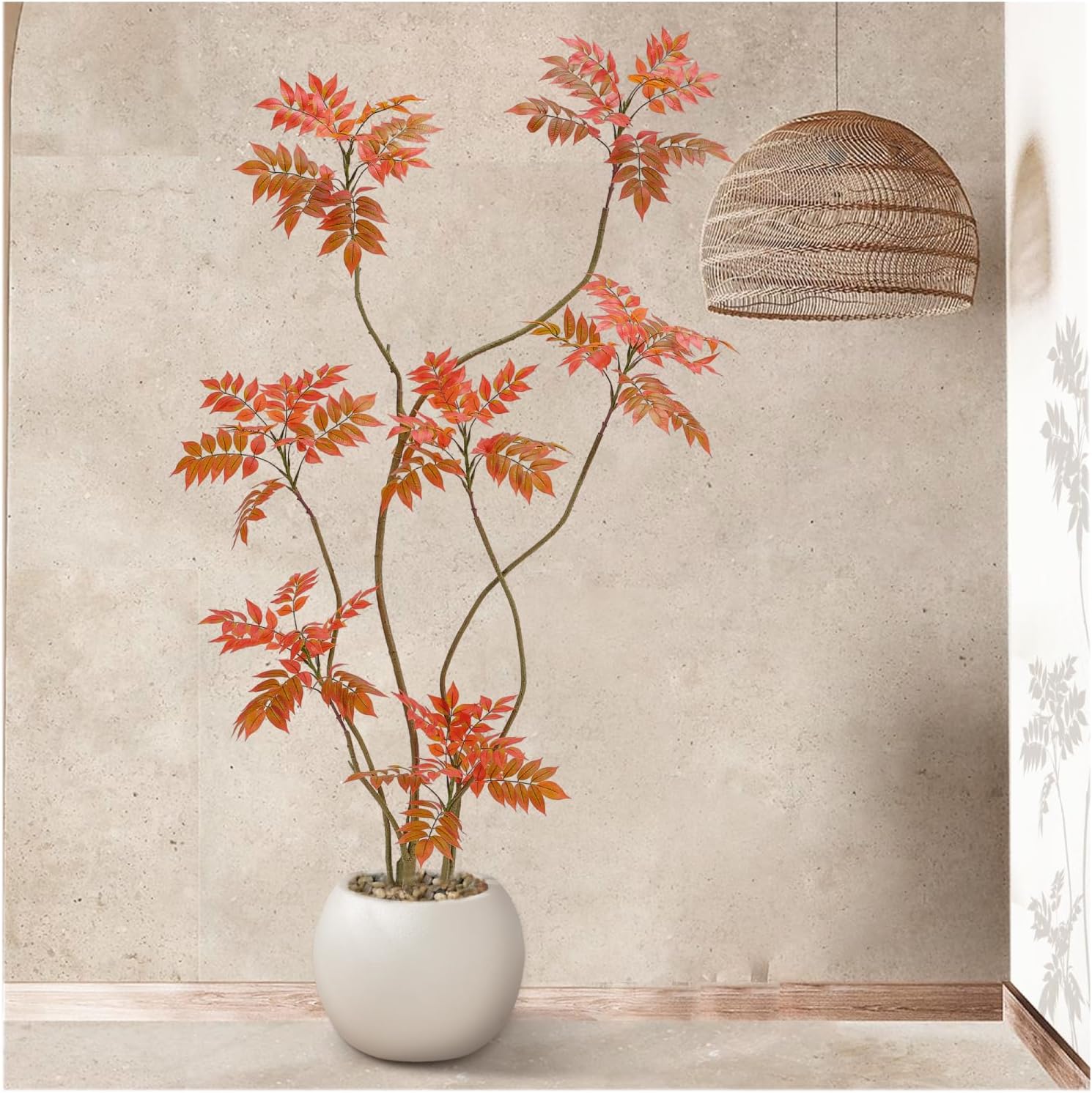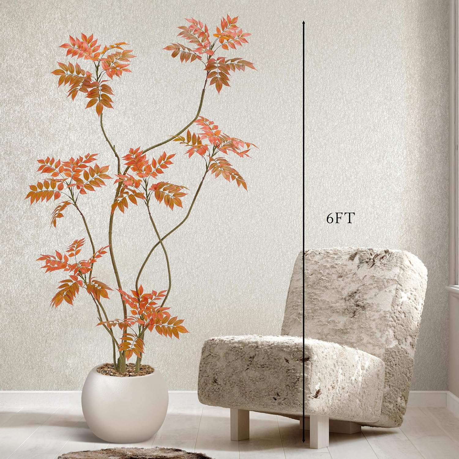 - Home Decor Accents: This 6ft/70in tall faux sumac tree contains 500 pieces real touch leaves who made of silk and each leaf has veins on it. Inclus a white planter(10"H x 10"W). The interior of the planter is made of sturdy concrete and the surface is decorated with non-falling coloured pebbles and the base use anti-tip tilt protection for greater stability