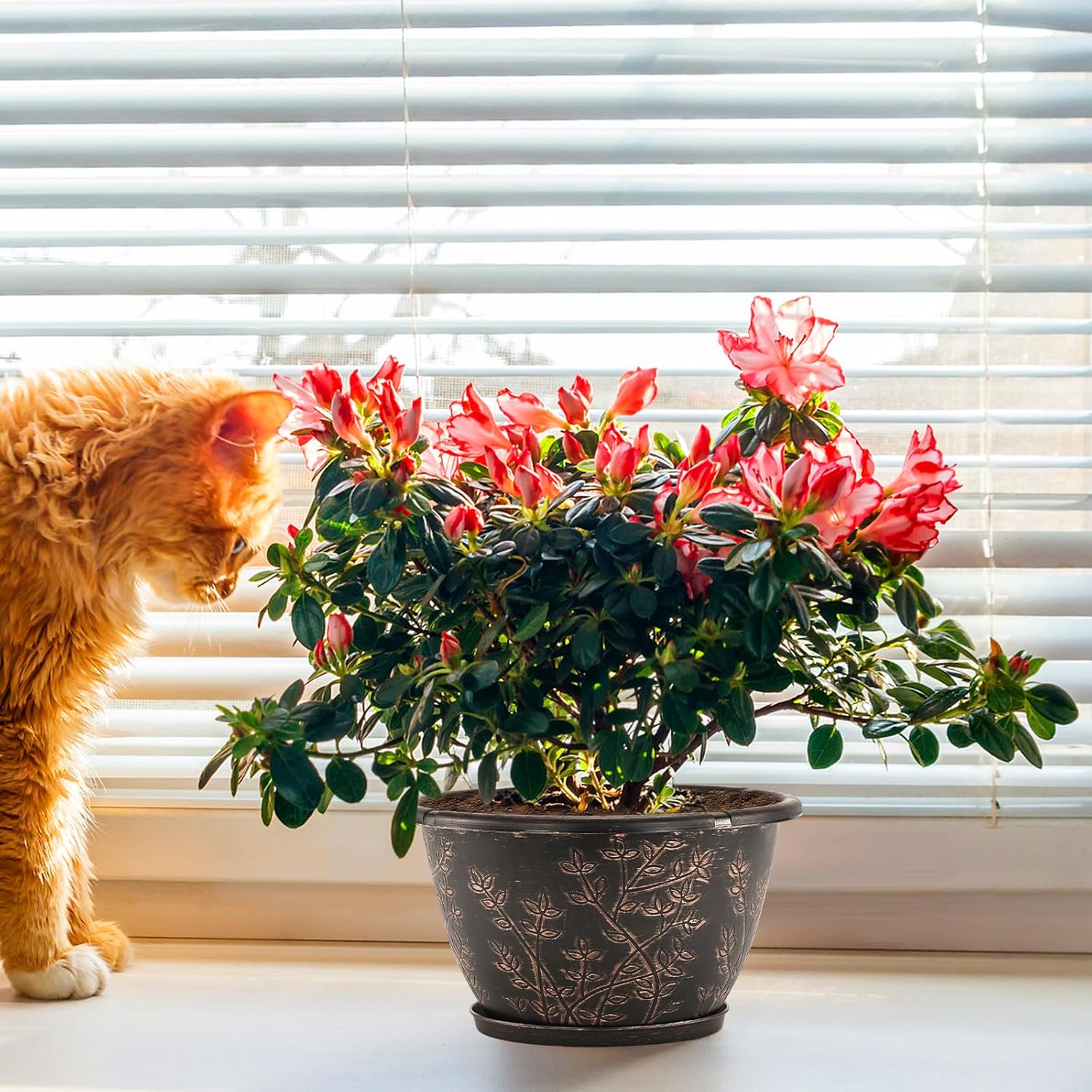 - 【Perfect Size & Retro Style】Top diameter: 12 inch, bottom diameter: 6.5 inch, height: 6.9 inch, capacity: 2 Gallon. 12 inch planters for indoor plant is perfect for planting medium to large sized plants.These flower pots outdoor is designed with climbing vines which is not just drawn on, they are “carved” into the surface. Plastic plant pots have a metal copper etching that is very attractive and add a retro feeling.