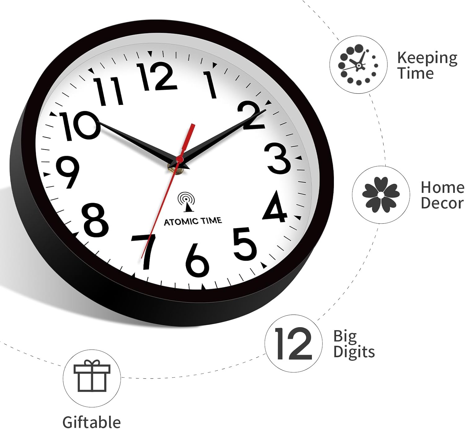 Atomic Wall Clock Analog 12 Inch Battery Operated Modern Decorative for Living Room Kitchen Office Bedroom Bathroom(Black)