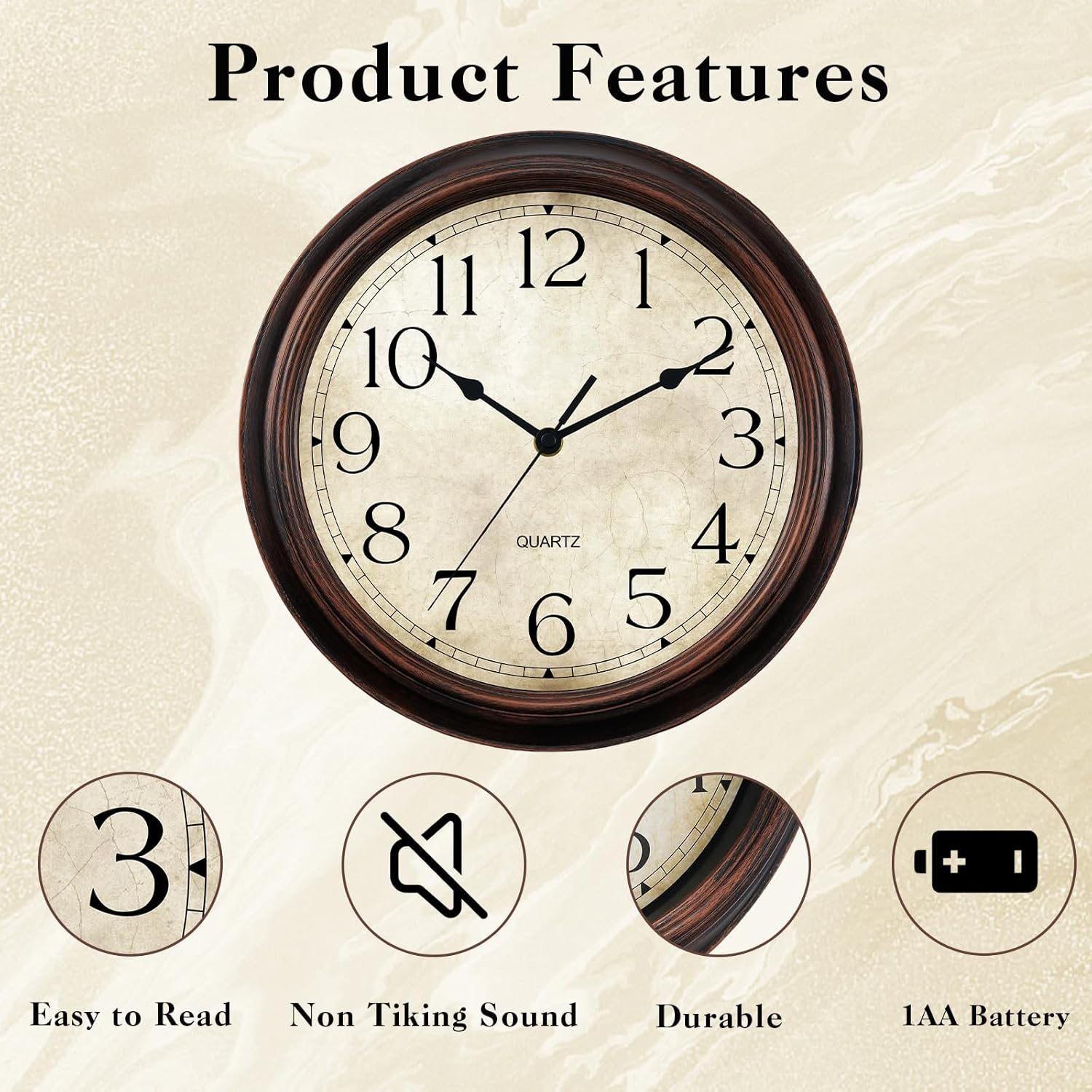 - [EASY TO READ] - Black hour, minute, seconds hands, plastic special copper case, vintage/retro design, large black numbers against, easy viewing and pleasing to the eye, the glass will keeps dust away from dial and give you a beautiful clocks.