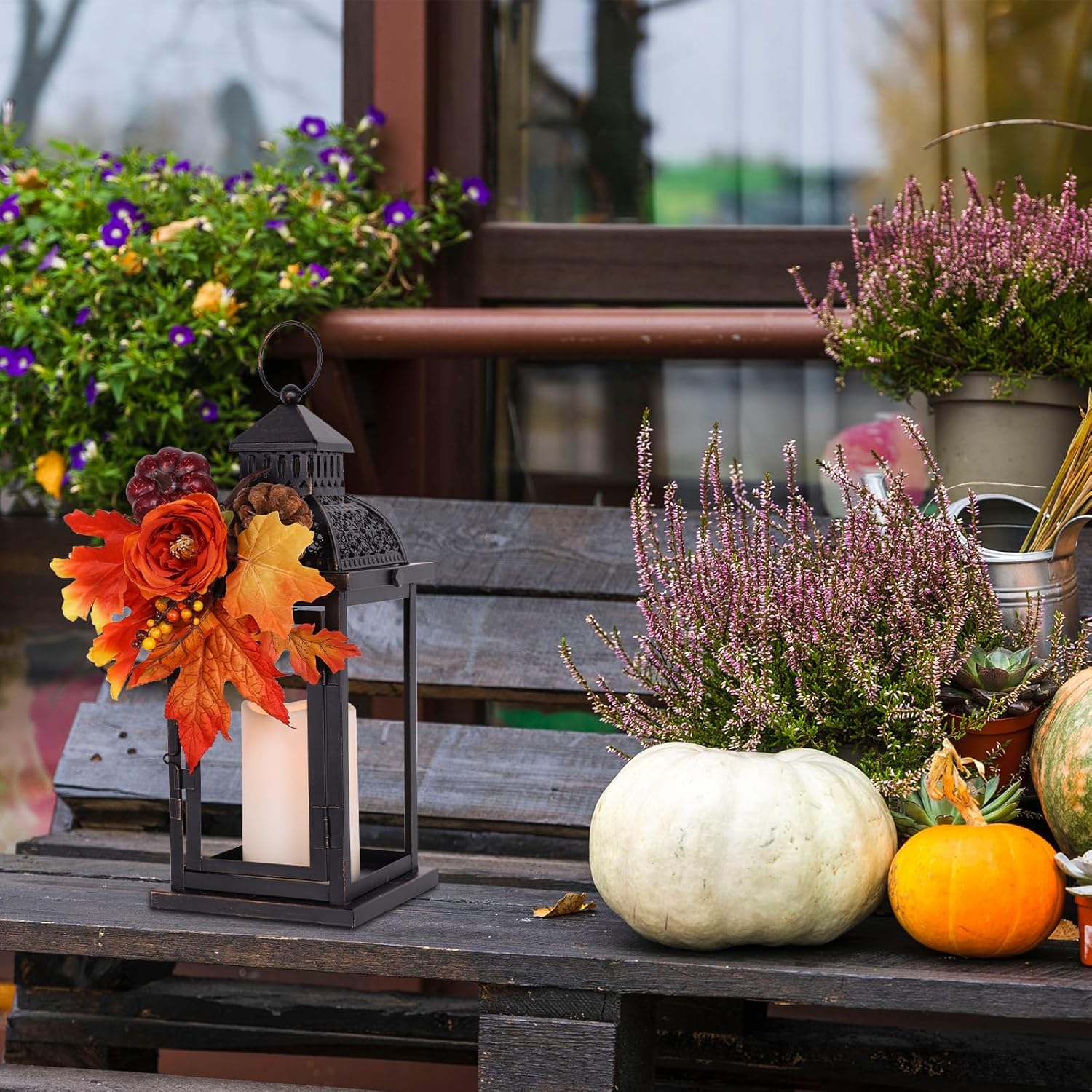 - 🍁【THANKSGIVING DECORATIVE CANDLE LANTERN】: NEEDOMO large square lanterns are hand painted with a distinguished, rustic metal finish effect, Black&copper metal features a distressed brushed look. Hollowed-out vintage design on the top adds a touch of classic beauty, creating an elegant appearance. The lantern attaches a Fall teardrop wreath with pumpkins, pine cones, berries.Turn on the LED candle to create an autumn atmosphere of gratitude and harvest, bringing warmth and good wishes to family and friends.