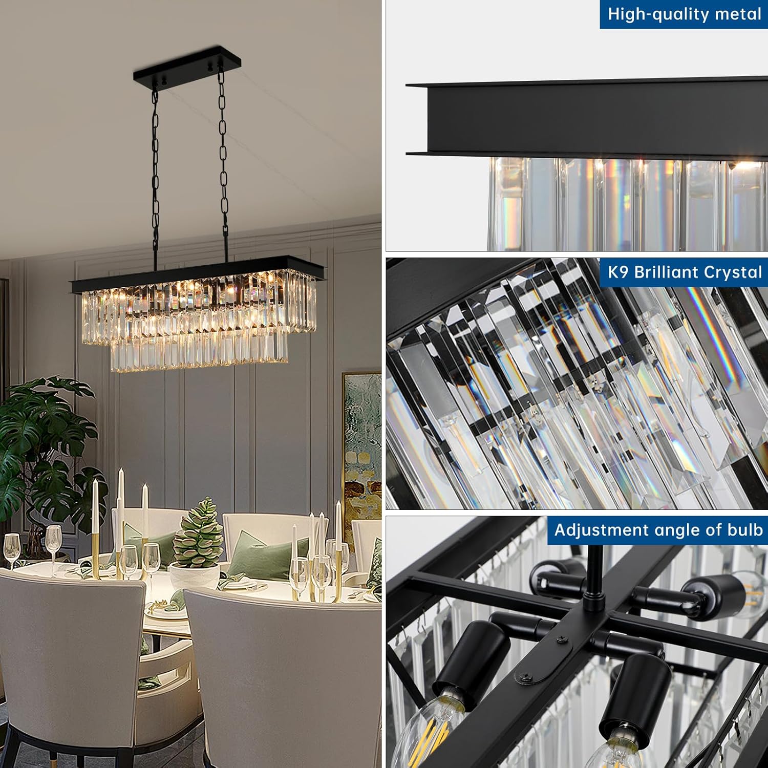 - BLACK CRYSTAL CHANDELIERS:This chandeliers for dining room using K9 crystal with 2-tier design and black rectangular lamp frame.When you turn on the light,the lighting will reflect through the crystal,adding a romantic and unique atmosphere to your room