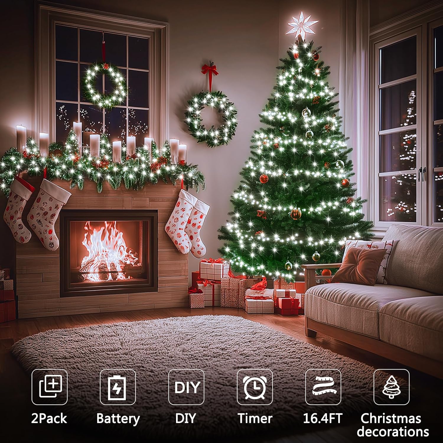 - 2-Pack Fairy Lights: The battery-powered fairy lights are 16.4 ft long (about 5 meters) and come with 50 LED beads. The dark green copper wire is perfect for Christmas decoration
