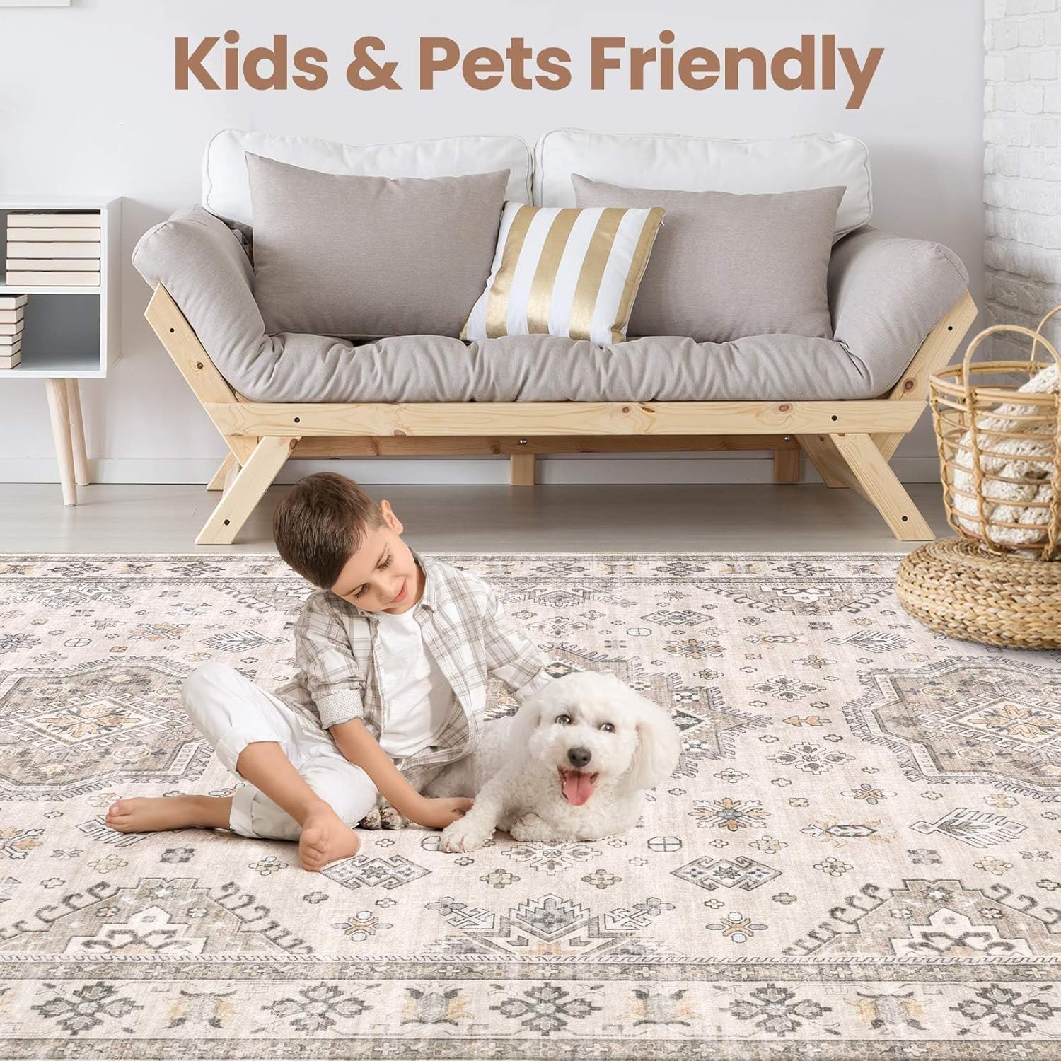 Washable Area Rugs for Living Room - 7x9 Neutral Vintage Distressed Floral Farmhouse Boho Large Soft Floor Rug Indoor Non Slip Carpet for Living Room Bedroom Dining Room Office - Beige Brown