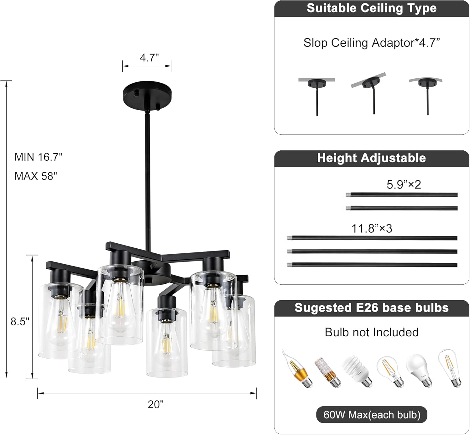 - Unique Design Aesthetic:Modern farmhouse chandelier features a matte black metal frame and 6 clear glass shades, creating visual tension between the cool, hard metal and lightweight glass. Dining room chandelier features a 360° downward glare-free design that reduces dust accumulation by 70%. Black light fixture is ideal for kitchen islands, dining tables, living rooms or bedrooms