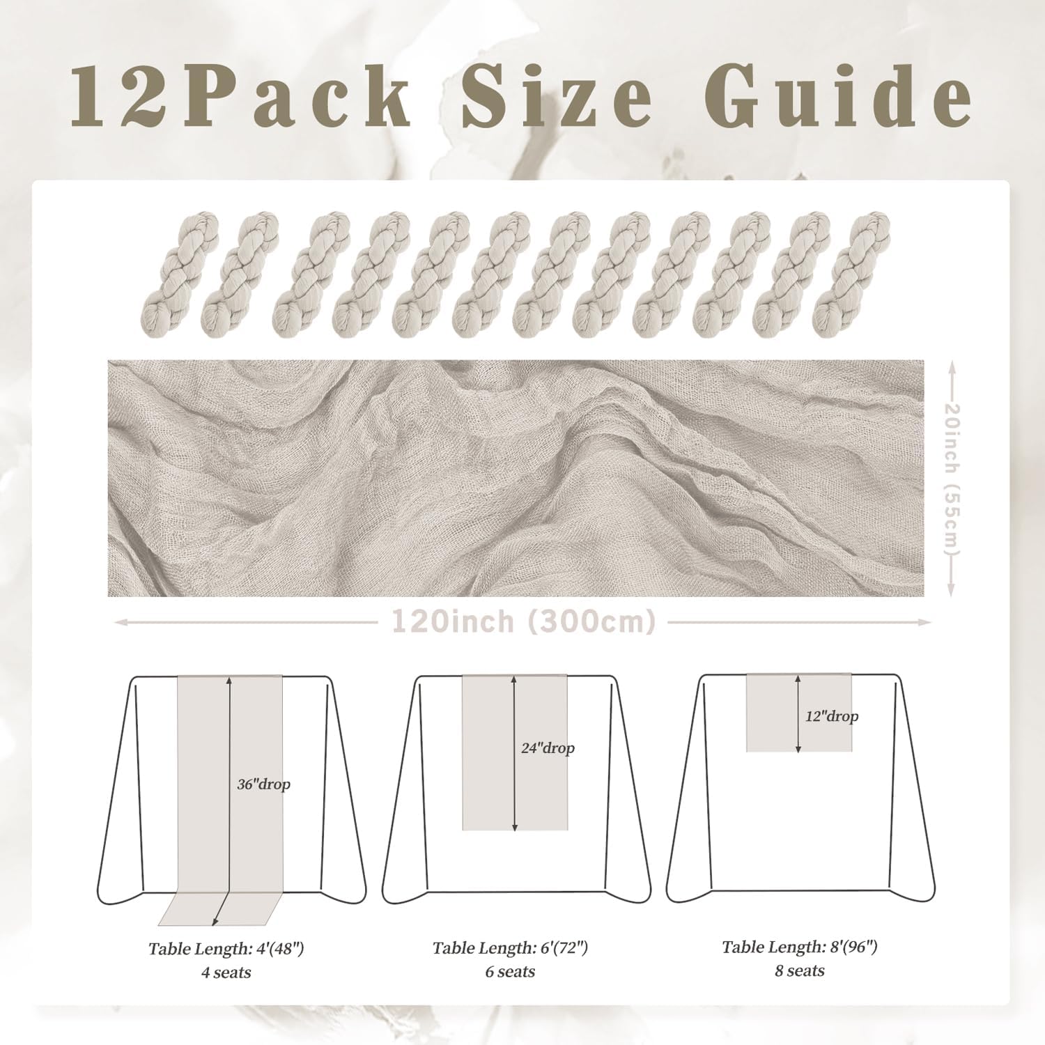 - Cheesecloth Table Runner Size: You will receive 12 rose brown cheesecloth tablerunner, each measuring 20 x 120 inches. The quantity is sufficient for you to decorate various romantic occasions. It can decorate most shaped tables, such as rectangular tables, round tables, and cocktail tables. It is long enough to decorate a large table and be placed perfectly and elegantly on the tabletop, adding a romantic atmosphere to your occasion.
