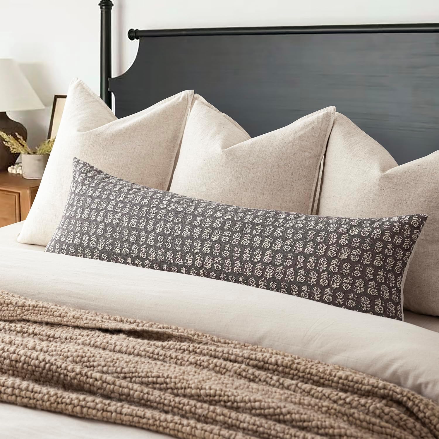 Foindtower Set of 2 Decorative Vintage Long Lumbar Throw Pillow Covers Neutral Modern Farmhouse Cushion Covers Floral Home Decor For Sofa Couch Chair Bedroom Living Room Outdoor,14×36 Inch,Rustic Gray