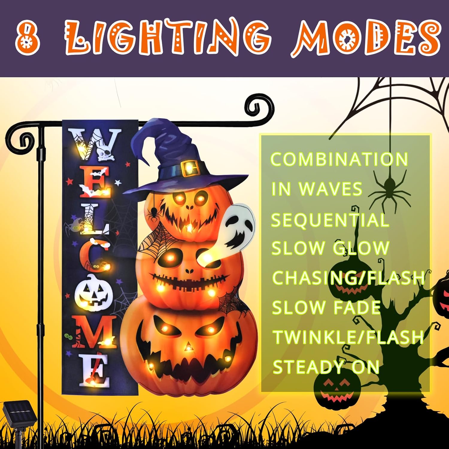 Halloween Lighted Garden Flag, Solar Yard Flag for Outside, 8 Modes Double Sided Welcome Halloween Pumpkin Outdoor Decorations for Home Porch (Pumpkin-12x18)