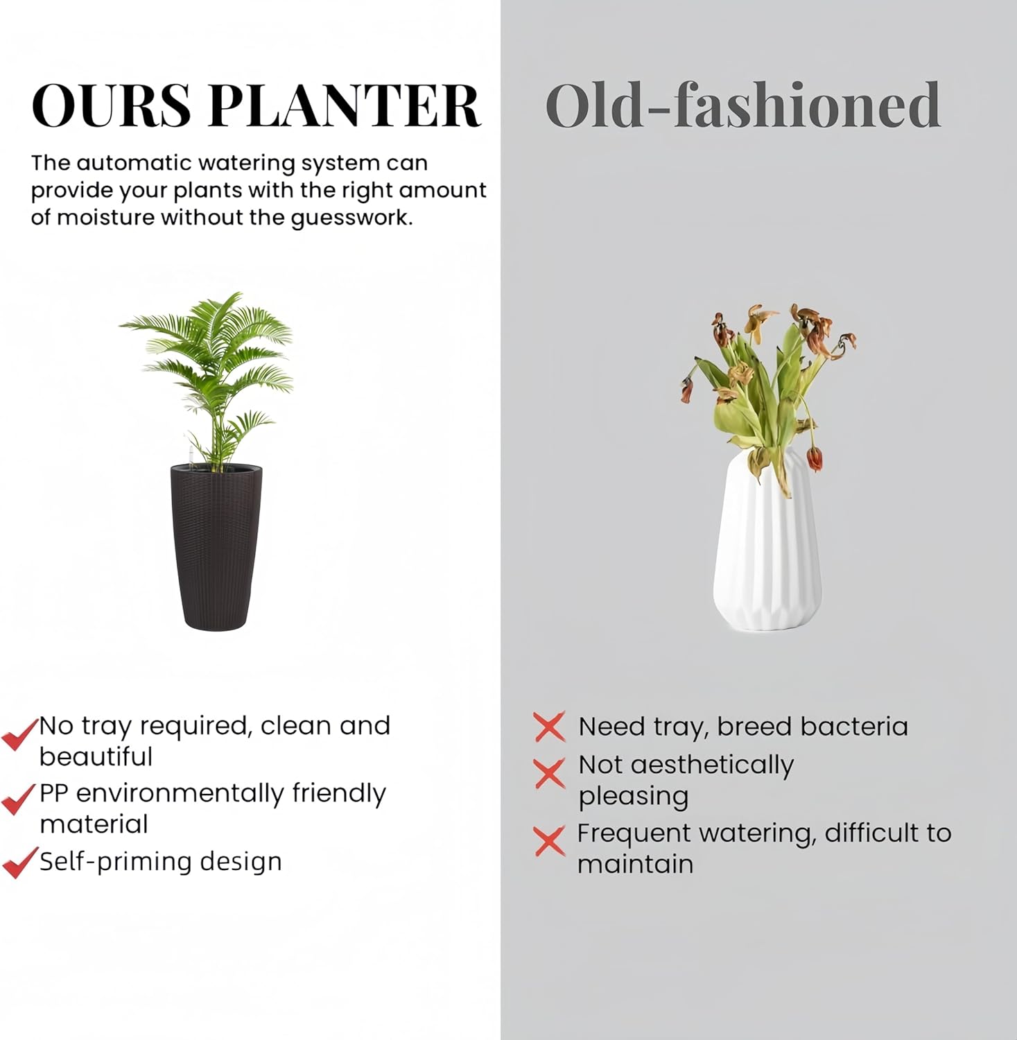 - 【Smart Watering System】Simplify plant care with our planters' built-in drainage and automatic watering features. It ensures that the risk of root rot is minimized, when the water level is below the plant's roots, the automatic watering system can provide your plants with the right amount of moisture without the guesswork.