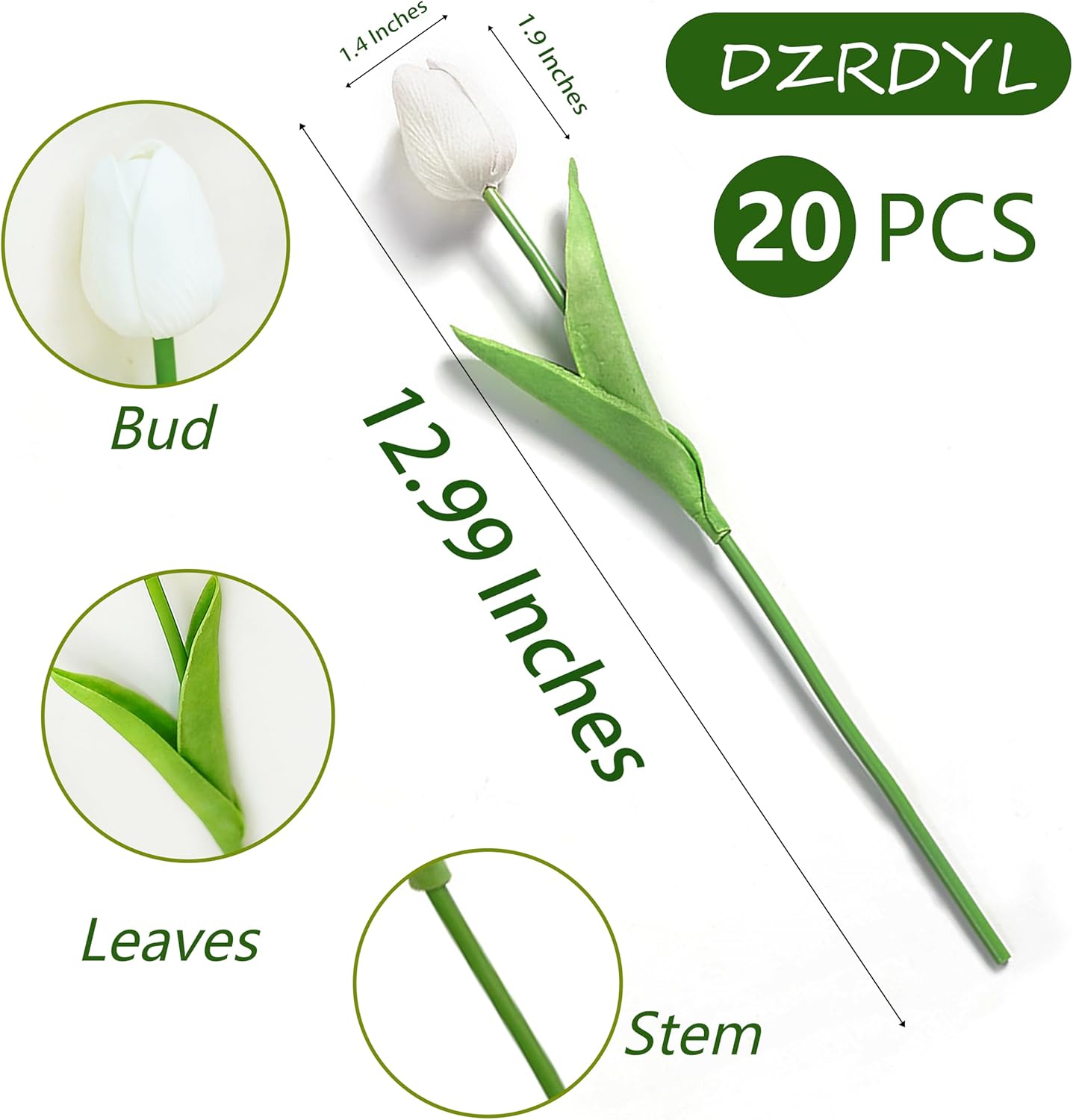 20pcs White Artificial Tulip Fake Flower 12.9 Inch Spring Mother's Day Easter Gift for Home Kitchen Wedding Decoration