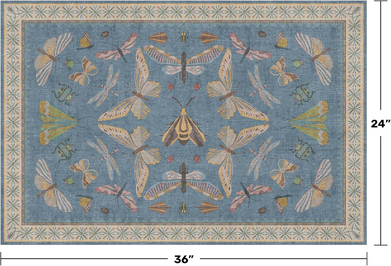 Blue 2x3 Washable Rug for Entryway Indoor, Kitchen Floor, Bathroom, Non Slip Low Pile Stain & Fade Resistant, Waterproof Insect Floral Decor