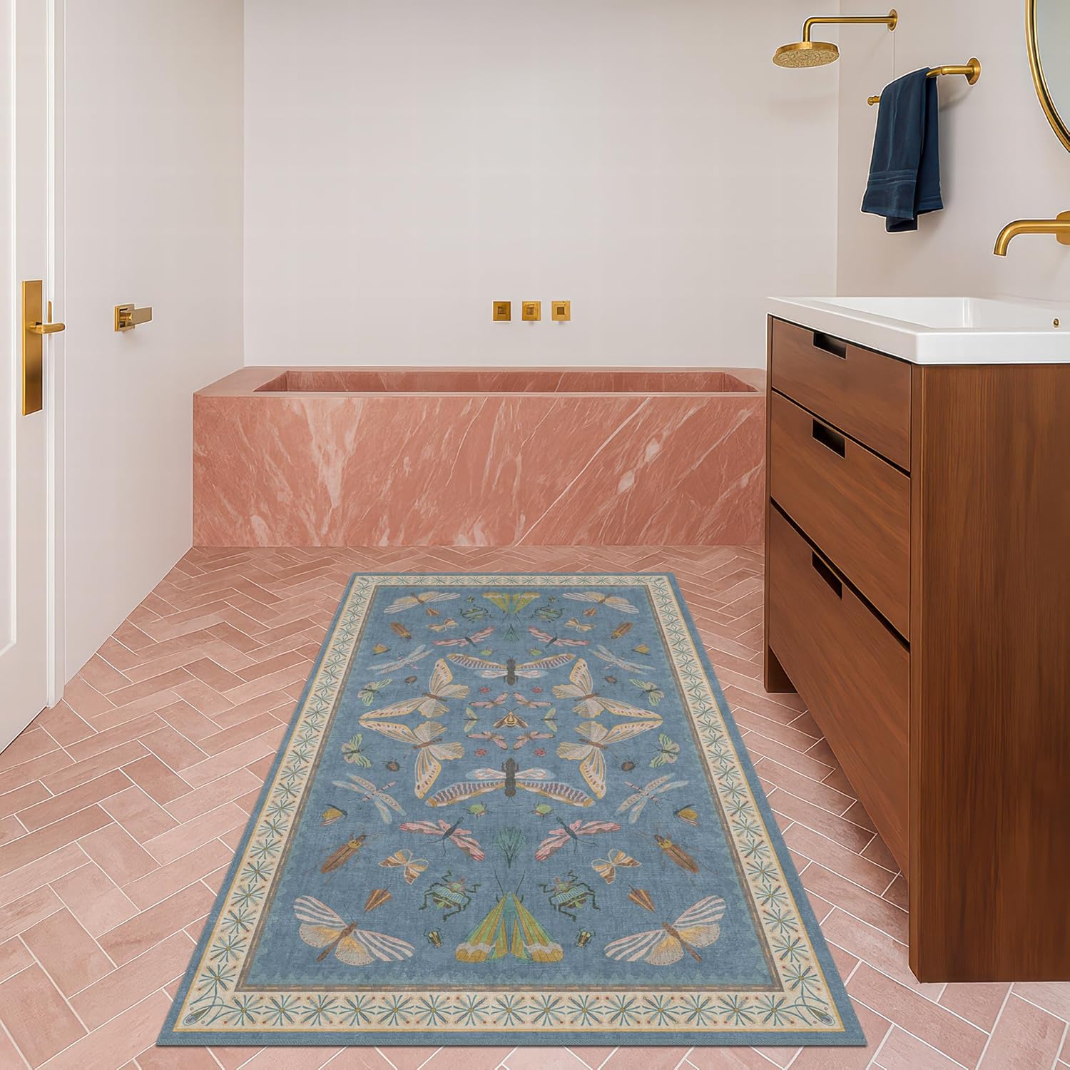 Washable Blue Rugs for Bedroom Bedside - 3x5 Laundry Room Rug for Large Kitchen, Entrance Indoor, Boho Insect Print Bug Décor, Non Slip Low Pile Fade Resistant