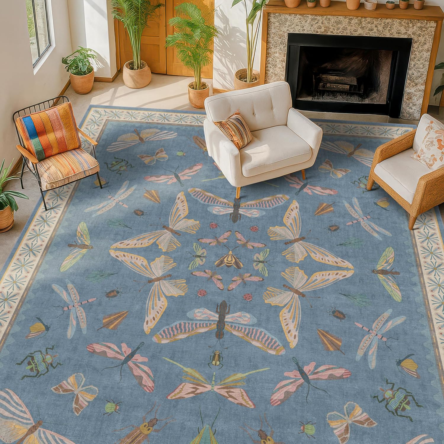 - Playful Nature-Inspired Design: Bursting with charm, this area rug features a whimsical display of butterflies, moths, beetles, and bugs, arranged in a symmetrical kaleidoscope pattern. The vivid blue background sets a lively stage for the detailed insect illustrations in cheerful tones of orange, pink, green, and lemon yellow. A scalloped edge surrounds the insect field, framed by a soft cream floral border that adds a handcrafted, vintage-inspired touch