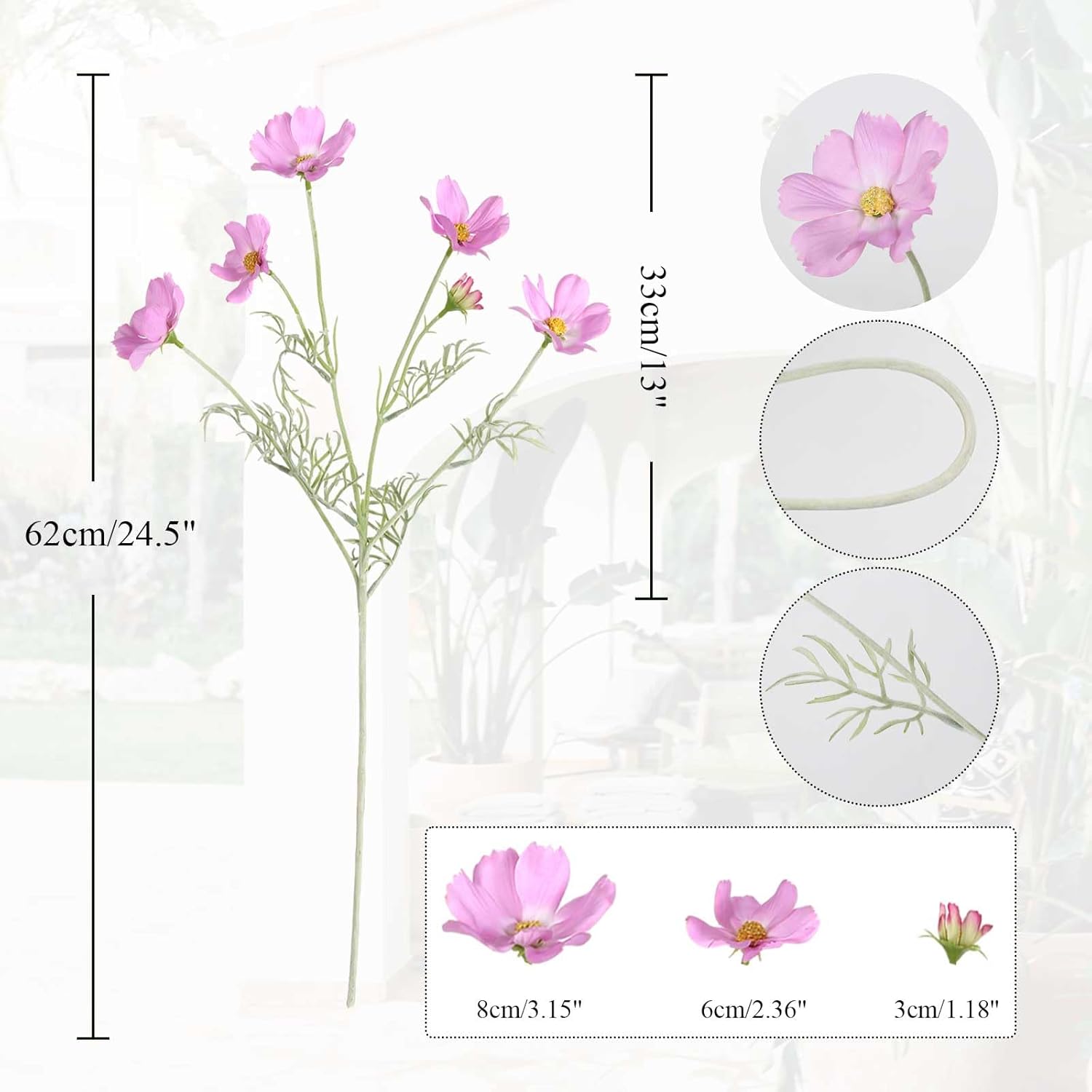 - Quantity and Size: Packed 5PCS light purple cosmos artificial flowers. Total approx. 24.5inches/62cm height, bigger daisy flower 3.15”/8cm, smaller 2.36'' /6cm, cosmos bud 1.18”/3cm. Each daisy flowers artificial wildflowers set with 4 large flower heads, 1 small and 1 bud, total with 30 flowers heads. The long stem artificial flowers is ideal for your tall flowers for floor vase floral arrangements