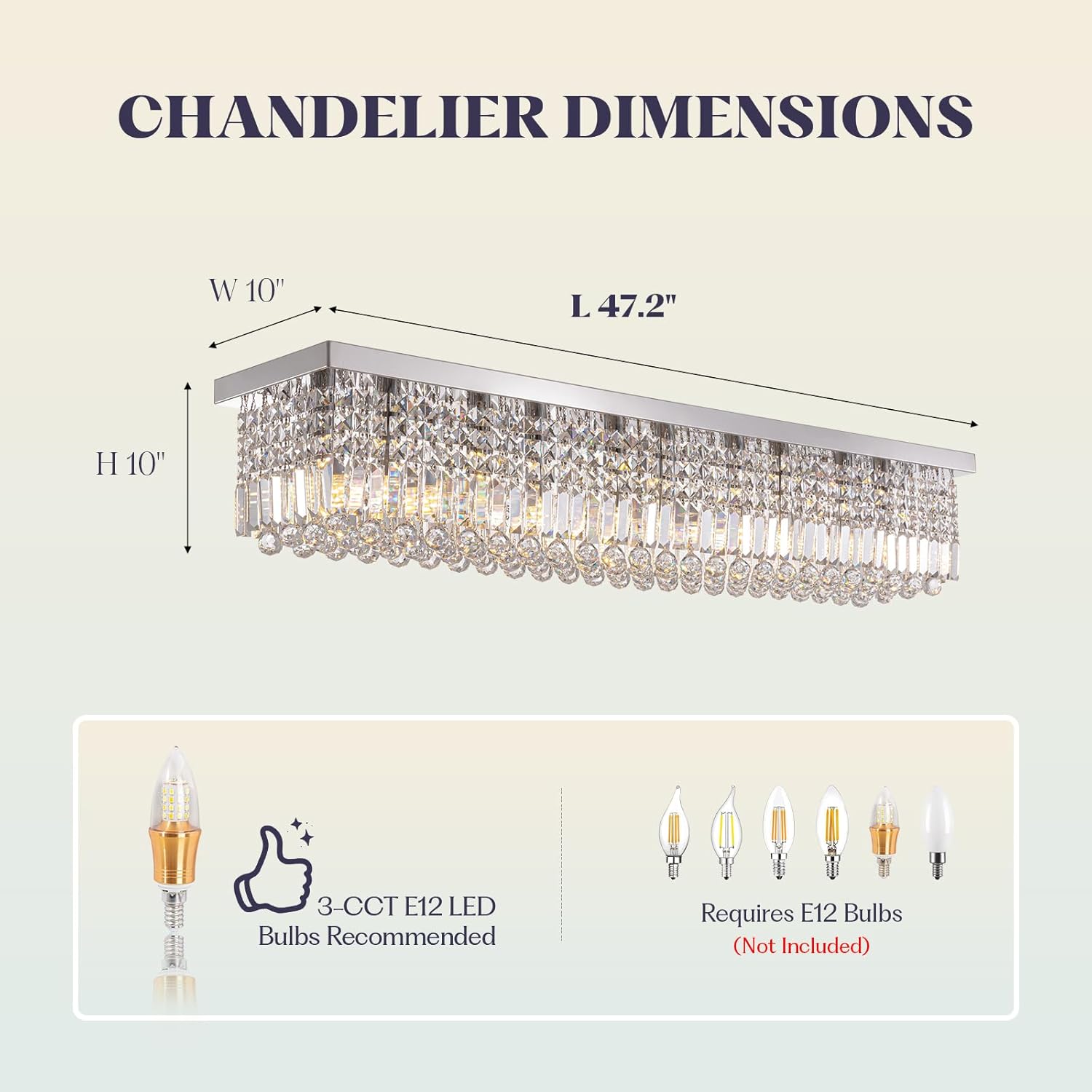 - BULB REQUIREMENTS: 10 E12 bulbs are required for the rectangular raindrop chandelier (max power 40W, not included). Compatible with a variety of E12 bulbs such as incandescent, fluorescent, CFL, halogen. You can use dimmable bulbs and dimmer switch (not included) to change the light color and brightness of the modern crystal chandelier
