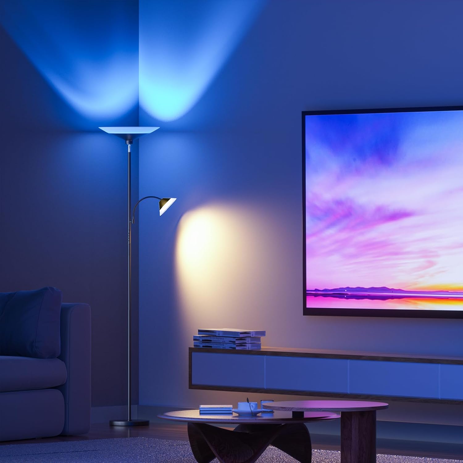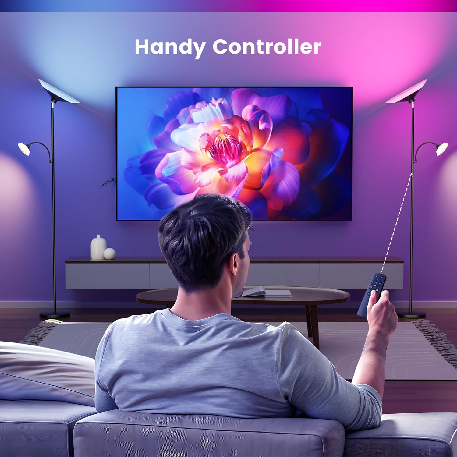 - 【Dual-Zone Lighting】This upgraded RGB torchiere floor lamp, adjust brightness (10%-100%) and color temperature (3000K-6500K), the warm light & RGB color creates cozy ambiance for movie nights or relaxation, the natural light provides flicker-free illumination for reading/working.