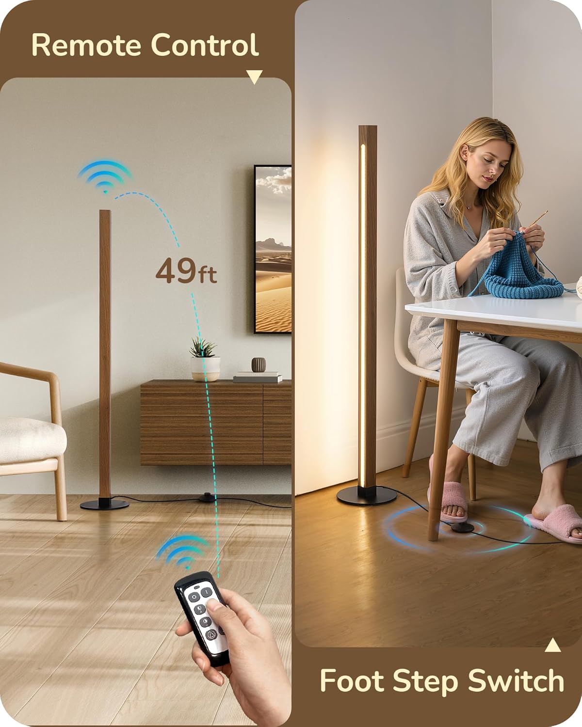 - [Remote & Foot Switch] Use the included remote control (up to 49ft range) for convenient access to this led corner lamp, or operate via the foot switch—tap to ON-2700K/4500K/6000K-OFF, or long press for stepless dimming