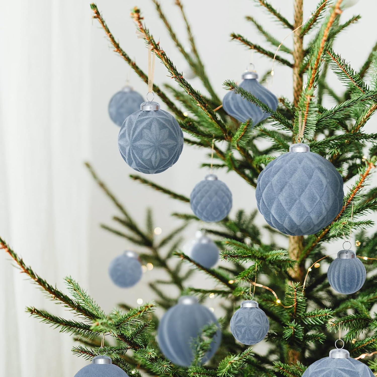 46PCS Velvet Christmas Ball Ornaments Set, Flocked Shatterproof Xmas Tree Decor, Assorted Hanging Ornaments with Loop for Holiday Home Decor, Christmas Tree, Mantel, Party Decoration (Gray Blue)