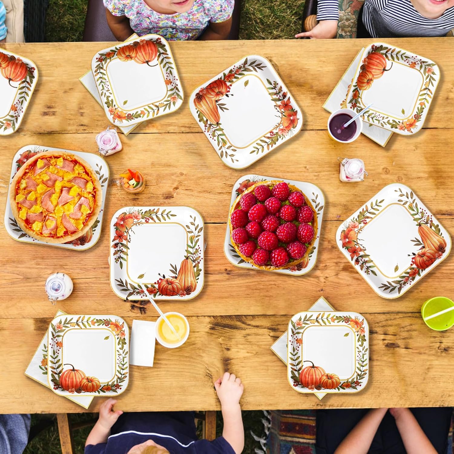 - 200Pcs Watercolor Pumpkin Plates:Our fall thanksgiving paper plates and napkins sets include 50 * 9'' fall paper plates, 50 * 7'' pumpkin plates, 100 * 6.5'' pumpkin napkins, great for cakes, snacks, and other types of dinner. The autumn thanksgiving party cutlery combination really adds dimension to your party, as your guests will love beautiful and exquisite designs that add color to your party
