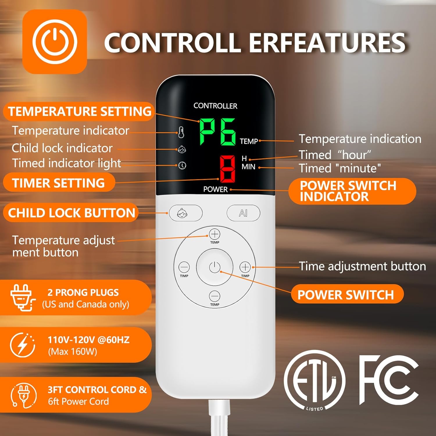 - ✅【EXCLUSIVE CHILD LOCK | WORRY-FREE WARMTH FOR FAMILIES】 Safety is non-negotiable. This is the electric blanket designed with your loved ones in mind. Our exclusive Child Lock function secures your settings, preventing accidental adjustments by curious kids or pets—a feature you won't find on standard models. Combined with full ETL certification and NTC overheat protection, you can truly relax and enjoy the warmth with absolute peace of mind.