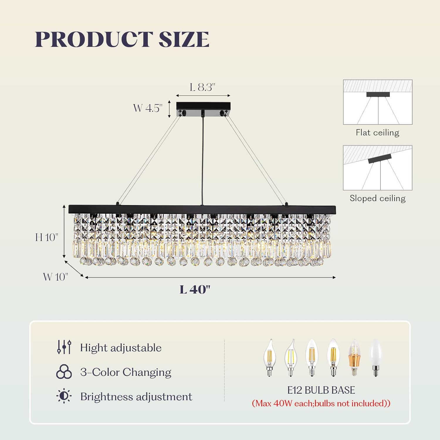 - 8-LIGHT DINING ROOM CHANDELIER: Requires 8 x E12 base bulbs (๐๐๐ฑ ๐๐๐ ๐๐๐๐ก, ๐๐ฎ๐ฅ๐๐ฌ ๐ง๐จ๐ญ ๐ข๐ง๐๐ฅ๐ฎ๐๐๐) to beautifully illuminate your space. Compatible with 3 color changing E12 LED bulbs, you can switch between warm light (3000K), neutral light (4500K), and cool light (6000K) to match any mood. Fully dimmable when used with dimmable bulbs and a compatible ๐๐ข๐ฆ๐ฆ๐๐ซ ๐ฌ๐ฐ๐ข๐ญ๐๐ก (๐ง๐จ๐ญ ๐ข๐ง๐๐ฅ๐ฎ๐๐๐), this rectangular light fixture offer customized lighting from cozy dinners to lively gatherings.