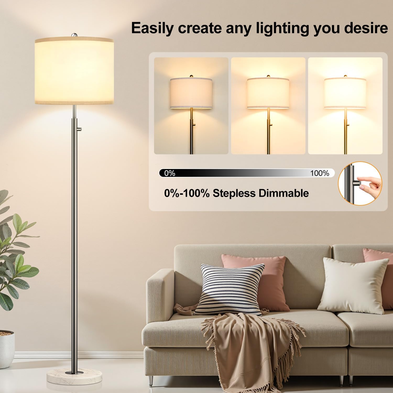 【Upgraded】 Dimmable Floor Lamp for Living Room, 11W LED Bulb Included, Modern Standing Lamp with Marble Base, Tall Pole Light with Linen Shade for Bedroom Reading Office Corner Nursery-Brushed Nickel