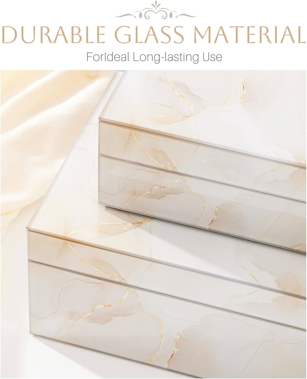 - Premium Quality Decorative Box Set: This set includes two beautifully crafted decorative boxes. The outer frames are made of luxury glass material, while the inner linings are soft velvet, ensuring durability and a luxurious feel. The large box measures 11.10Ă—7.44Ă—4.02 inches, and the small one is 8.35Ă—5.08Ă—2.83 inches. Ideal for storage, organization, or as a stylish keepsake, these boxes are a must-have for any home