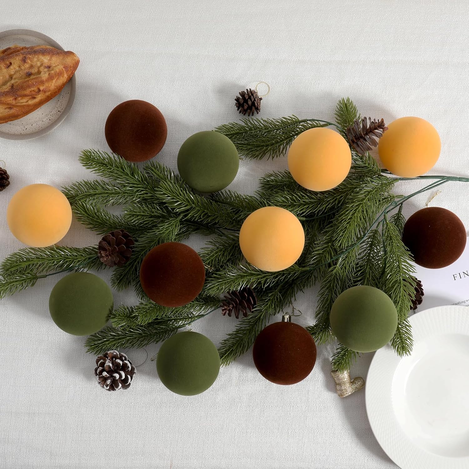 - Set of 12 Velvet Christmas Balls – 3.15" Diameter: This beautifully curated set includes 12 Christmas balls, each measuring 3.15 inches (8 cm). Featuring a mix of solid-colored velvet ornaments and balls with hand-painted accents, this set adds rich texture and visual variety to your holiday decorations.