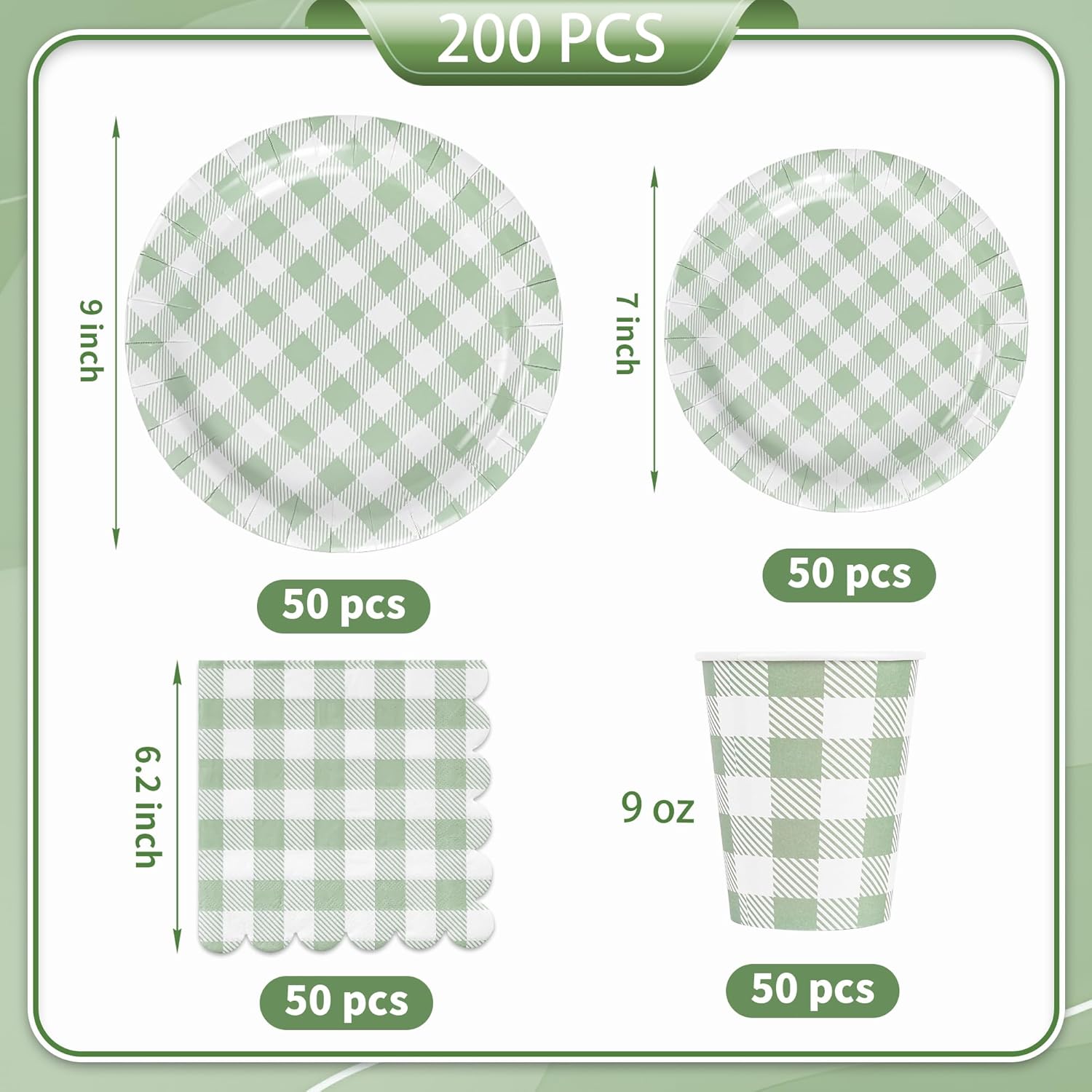 - WHAT’S IN THE BOX: Complete set with 9" sage green gingham plates*50,7"green checkered dessert plates*50,green gingham napkins (6.2" x 6.2") *50, sage green cups*50.These green gingham party decorations are an excellent way to entertain guests, sage green plaid not only makes people feel comfortable, but also brings joy to their mood. Durable green plaid party disposable plates napkins sets allow you to SERVES 50 GUEST at one time.