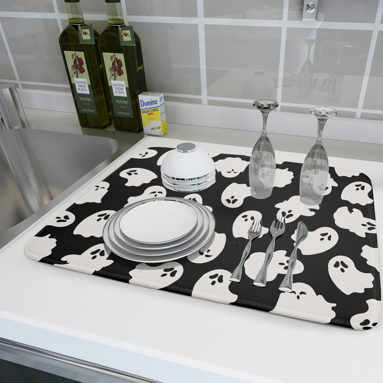 Halloween Dish Drying Mat for Kitchen Counter Cute Ghost Holiday Super Absorbent Reversible Microfiber Kitchen Countertop Protector Dishes Pad Large 18x24 inch