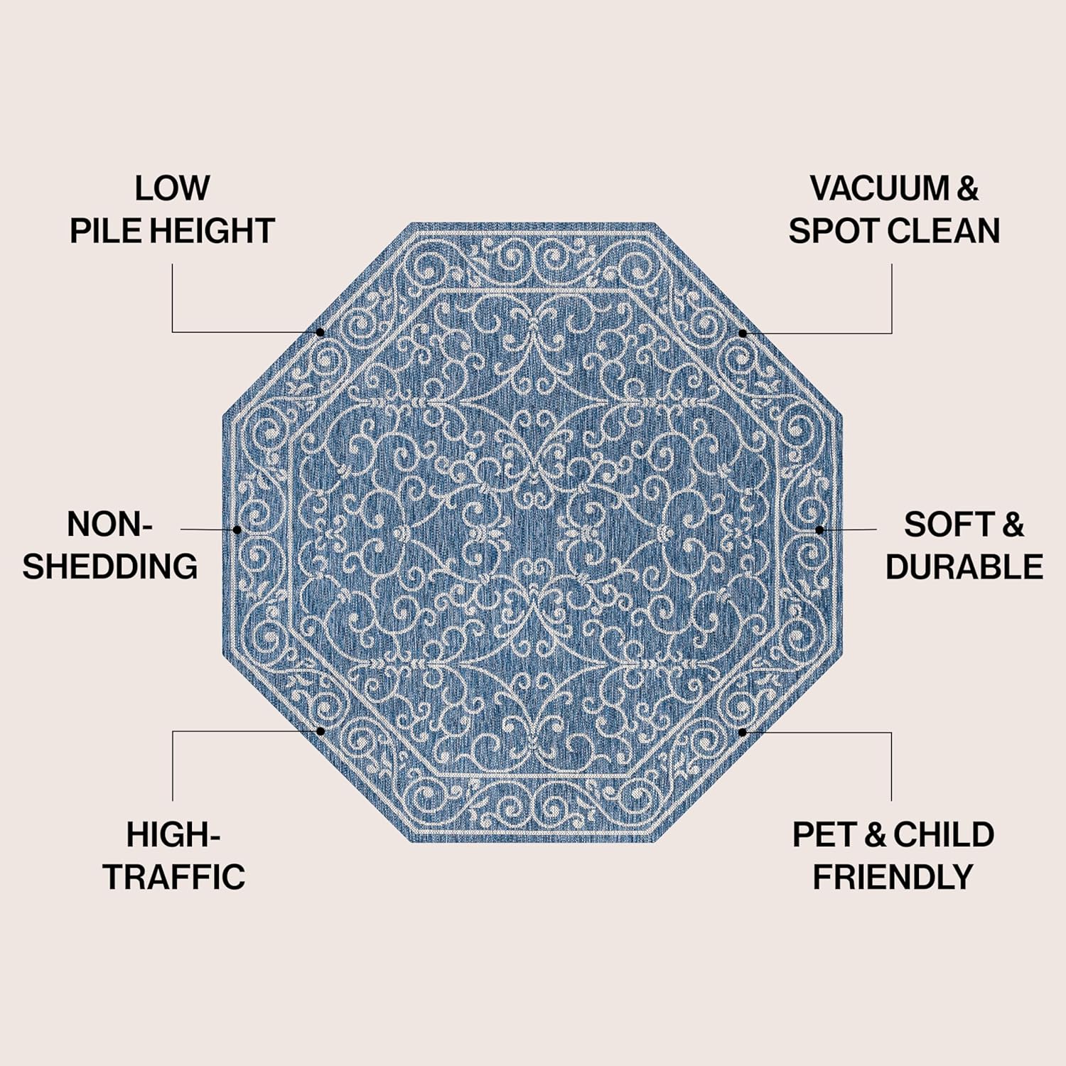 JONATHAN Y Vintage Filigree Indoor Outdoor Octagon Area Rug 8 Ft Navy/Gray, Charleston Textured Weave for Backyard, Patio, Porch, Easy-Cleaning, High Traffic, Pet-Friendly, Non-Shedding (SMB106D-8TGN)