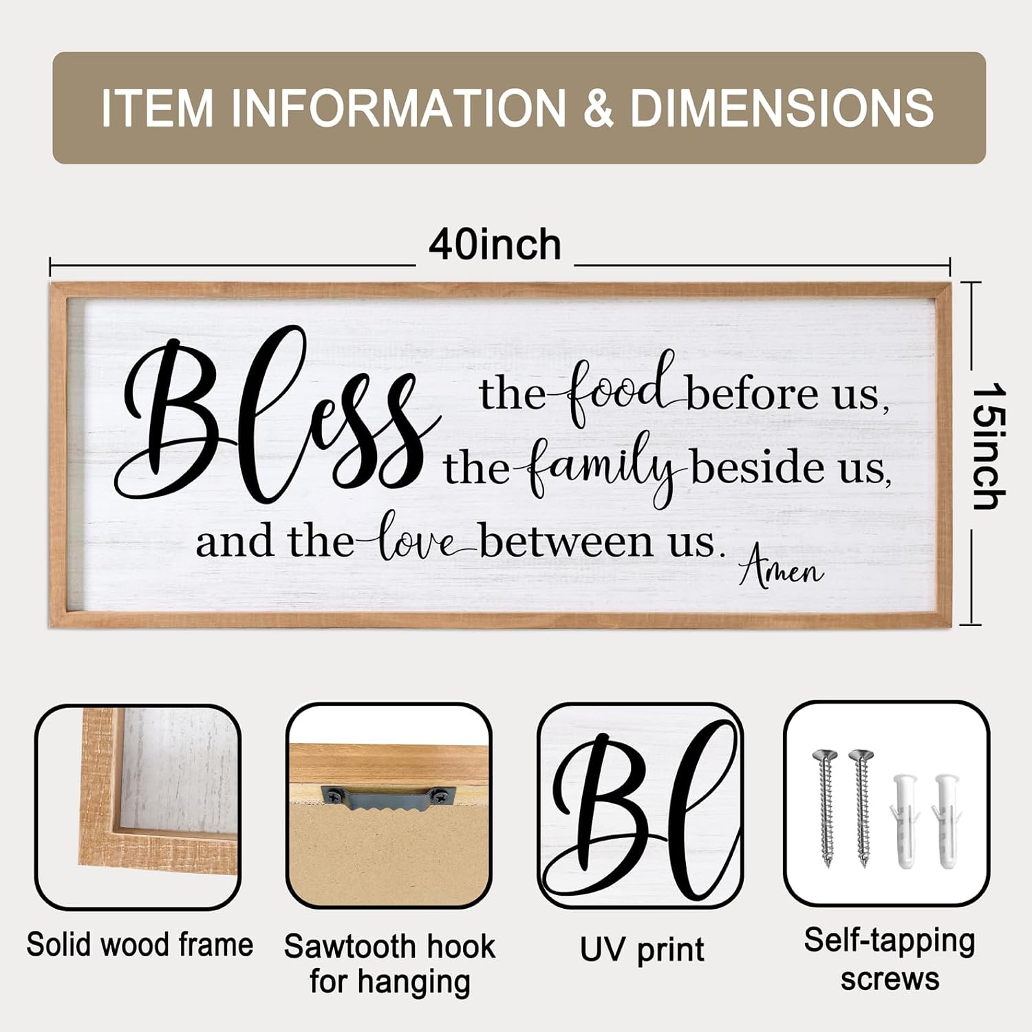 Bless the Food Before Us, the Family Beside Us, and the Love between us Framed Wall Art for Dining Room, 40''×15'' Holy Positive Religious Rustic Bible Verse for Christian God Jesus Christ Prayer