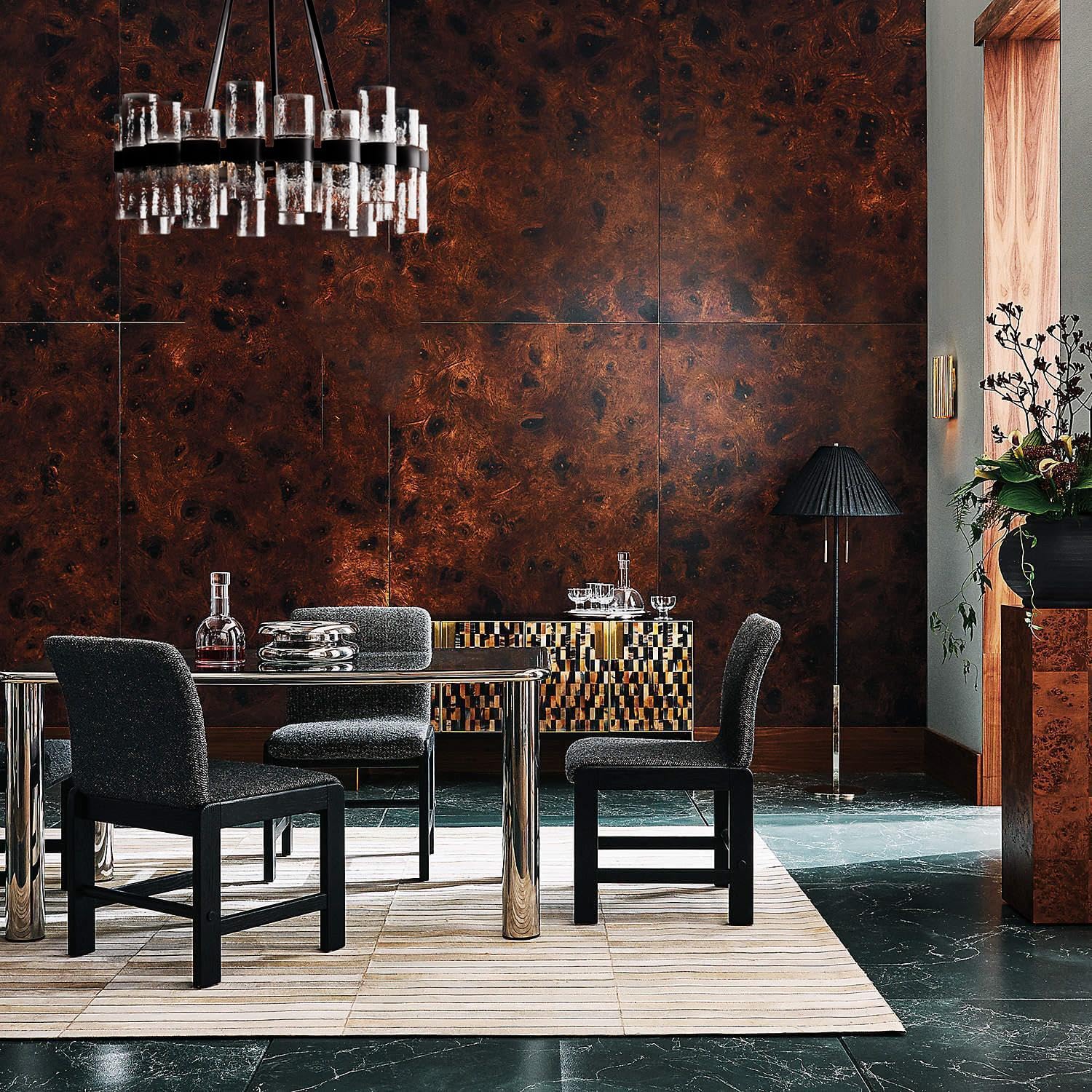 - [Premium Matrial] Made from recycled glass and a durable steel-brass frame, this chandelier showcases glass cylinders in bronzed-metal sleeves. The design creates an industrial glow while maintaining an elegant aesthetic