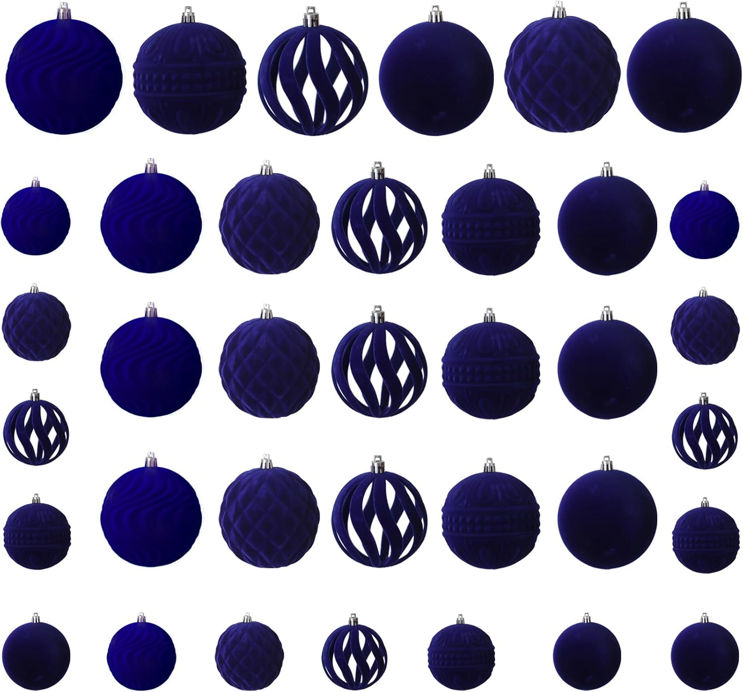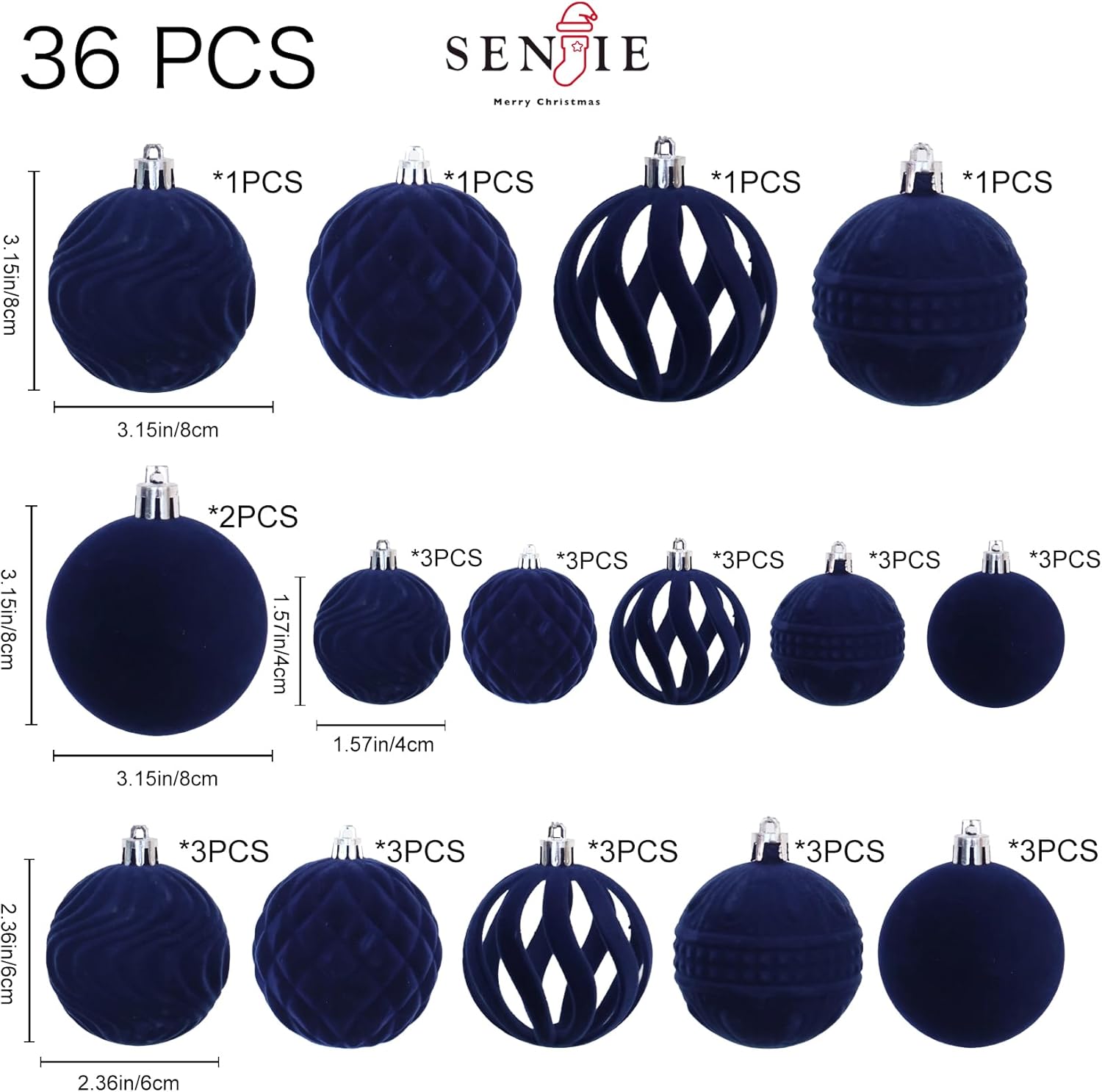 - Package List: the package contains 36pcs of flocked Christmas ball ornaments, measuring approx 3.15/2.36/1.57/inches in diameter, navy blue color,not only classic styles,but also innovative styles,including five shapes and nice texture can fully meet your needs for decorating