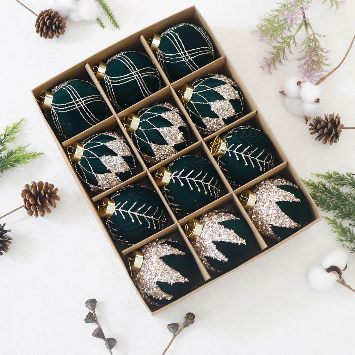 3.15INCH Green Velvet Ornaments for Christmas Tree, 12PCS Glitter Flocked Christmas Ornaments Decorations Balls Set Decor