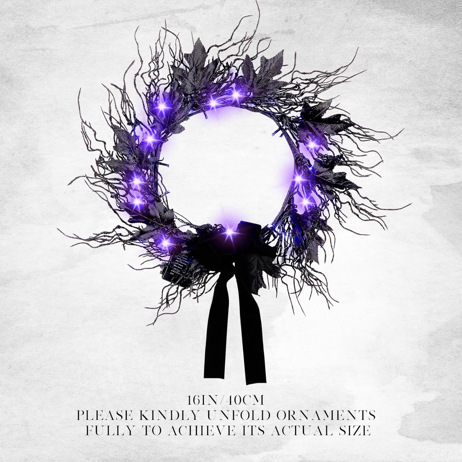 JORNOY 16inch LED Halloween Wreath with Battery Timer - Black Artificial Leaves&Silk Ribbon Decor Hanging for Front Door, Mantel, Porch, Wall, Party Decorations