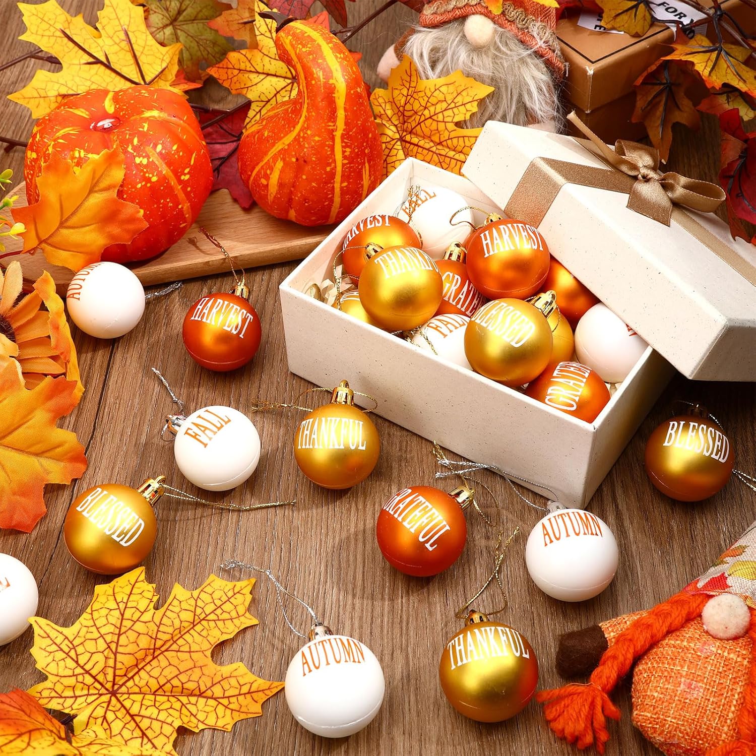 - Fall Hanging Ball Ornaments: The Thanksgiving Day hanging ornaments set includes 24 pieces Thanksgiving 3D ball ornaments, 6 different words matched with classic orange, gold, white, sufficient quantity and vivid colors can be used to create a warm and unique holiday atmosphere. Fall ornaments are ideal decorations for outdoor and indoor parties in autumn