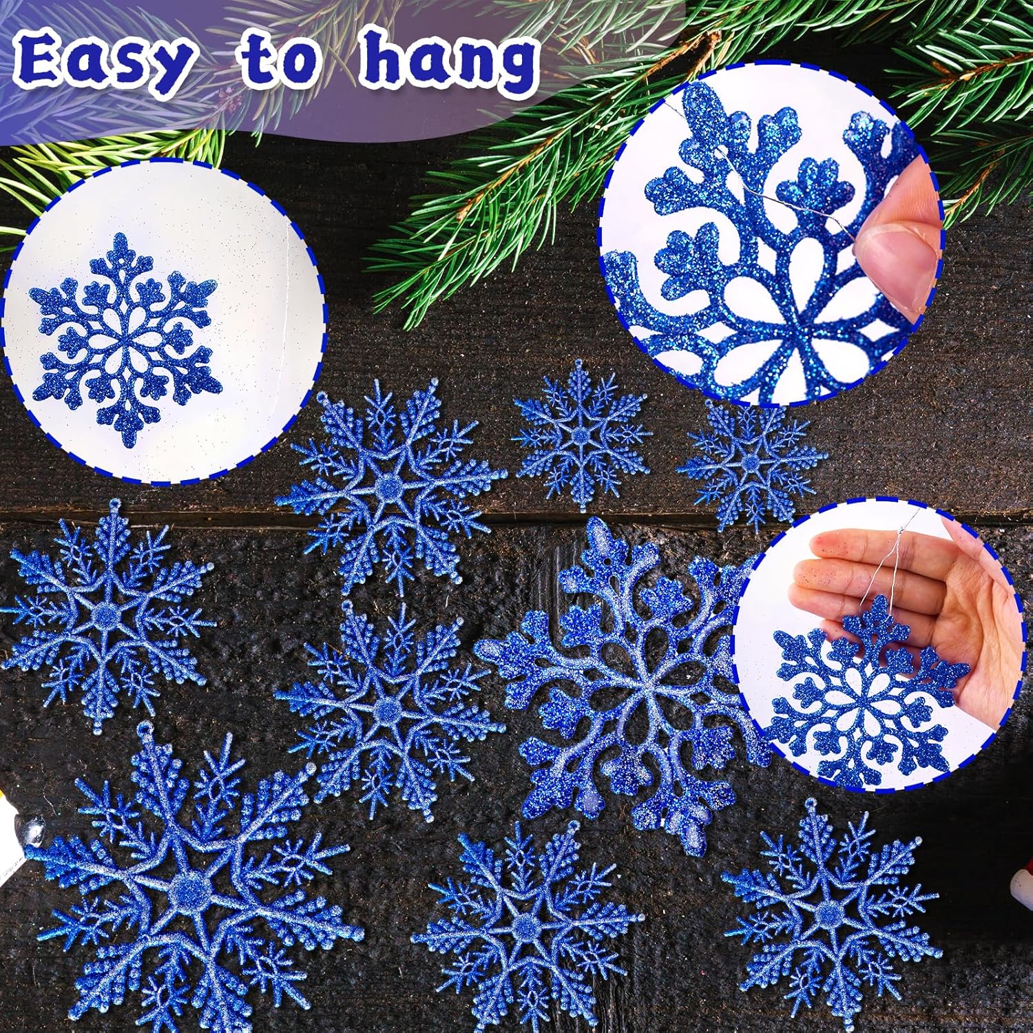 - Complete Snowflake Set:This 36-piece set of blue silver snowflake ornaments includes 4 sizes and 2 styles: 8pcs 4.2", 8pcs 4", 10pcs 3", and 10pcs 1.8". Double-sided glitter adds sparkle, and 36 silver hanging strings make them easy to use. It’s a stunning collection of christmas decorations for tree or crafts