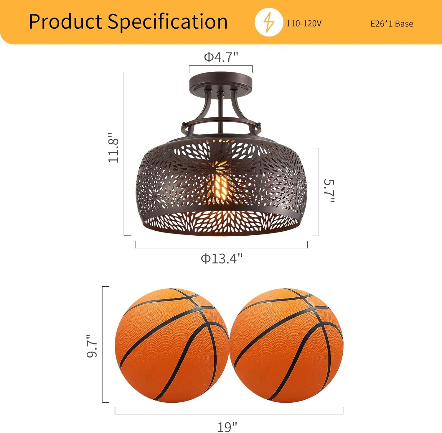 WUZUPS Chandelier Rustic Farmhouse Industrial Round Semi-flushmount Ceiling LED Light Fixture with Later-Cut Openwork Drum Shade, H 11.8" x W 13.4", Oil Rubbed Bronze