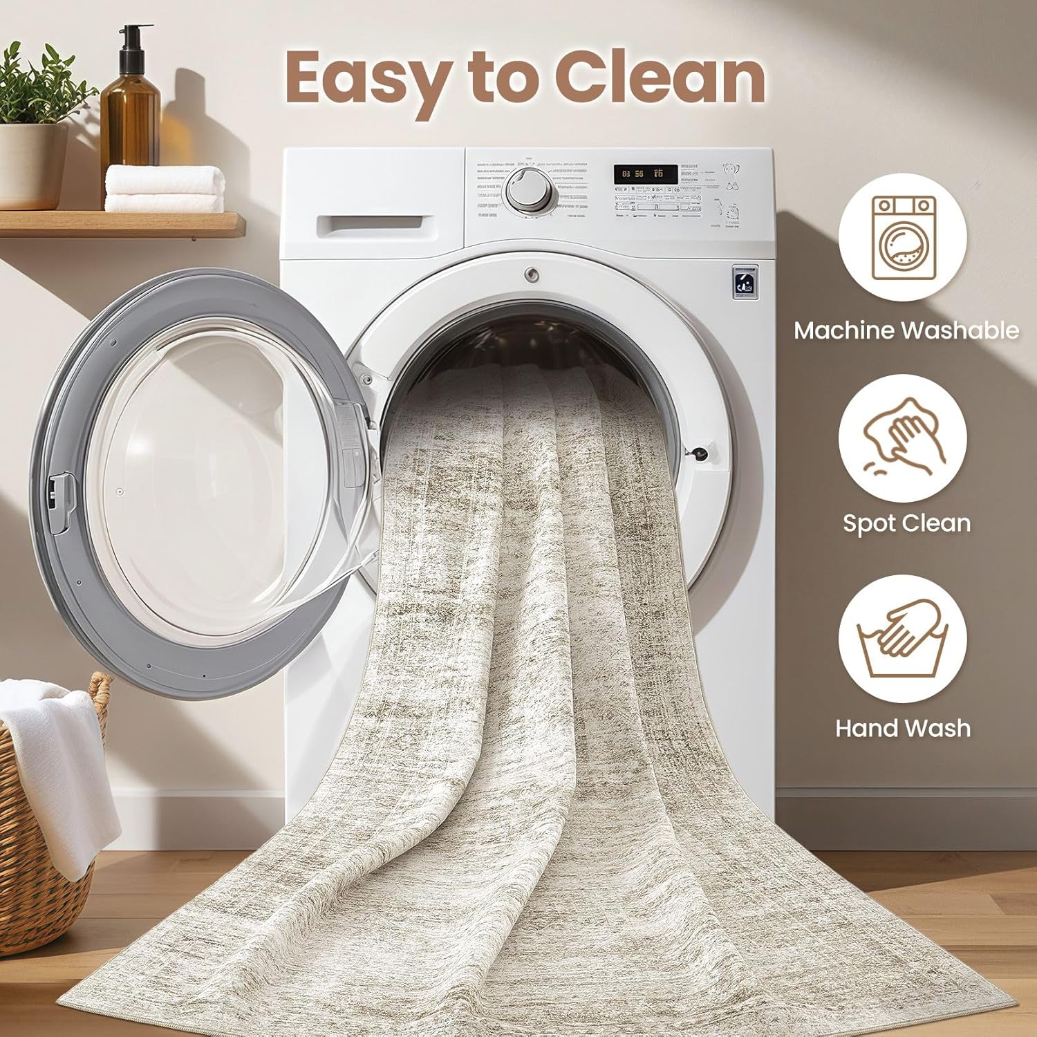 Washable Area Rugs for Living Room -7x9 Neutral Vintage Distressed Floral Farmhouse Boho Large Soft Floor Rug Indoor Non Slip Carpet for Living Room Bedroom Dining Room Office-Beige