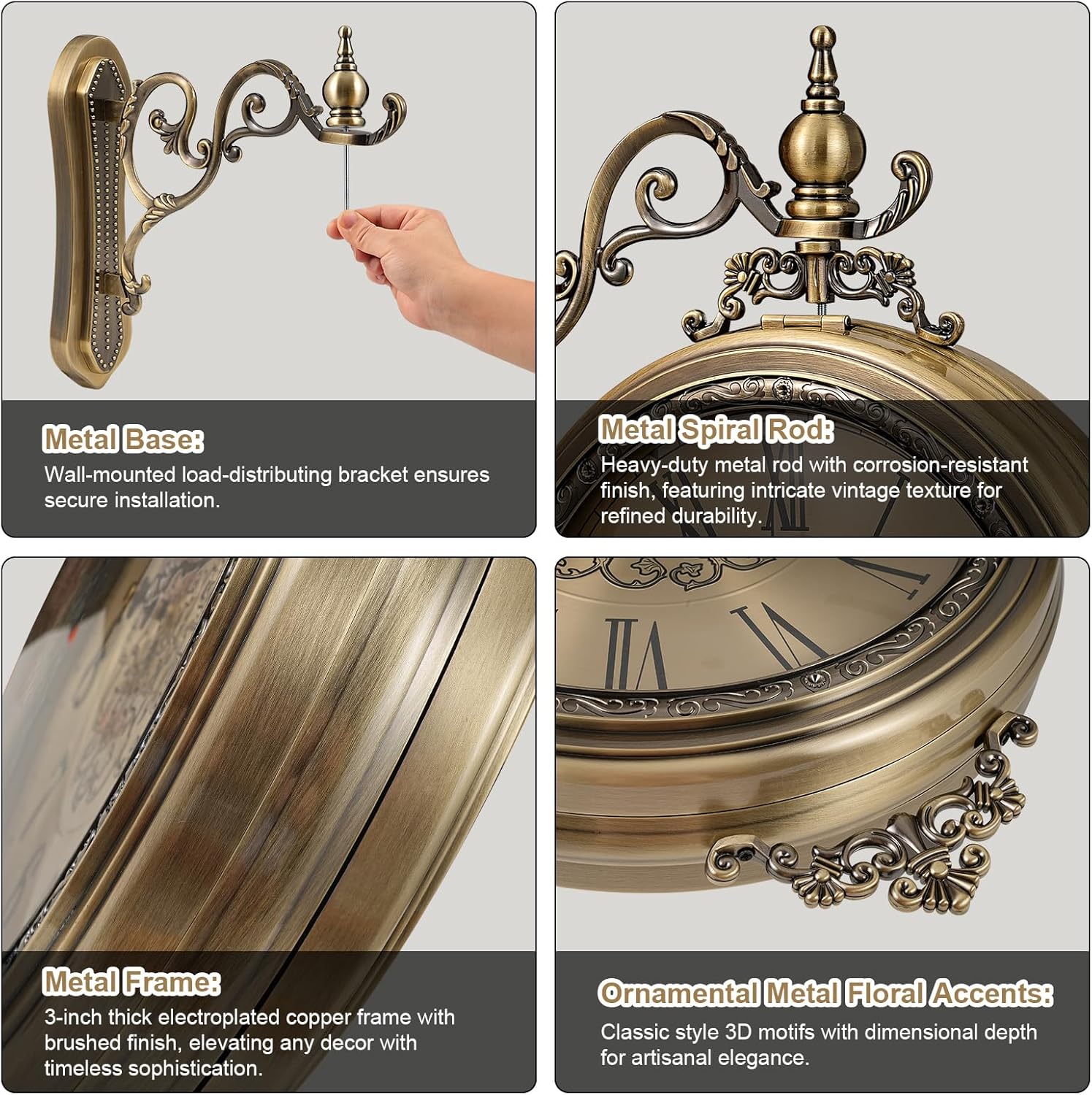 - βοΈ [Premium All-Metal & Glass Construction] Experience unmatched durability and sophistication. Meticulously crafted from solid metal and glass, this wall clock features a robust bronze frame enhanced by a hand-polished, brushed copper plating finish. The glass-covered faces protect the elegant dials, ensuring this antique clock remains a timeless piece of functional art.