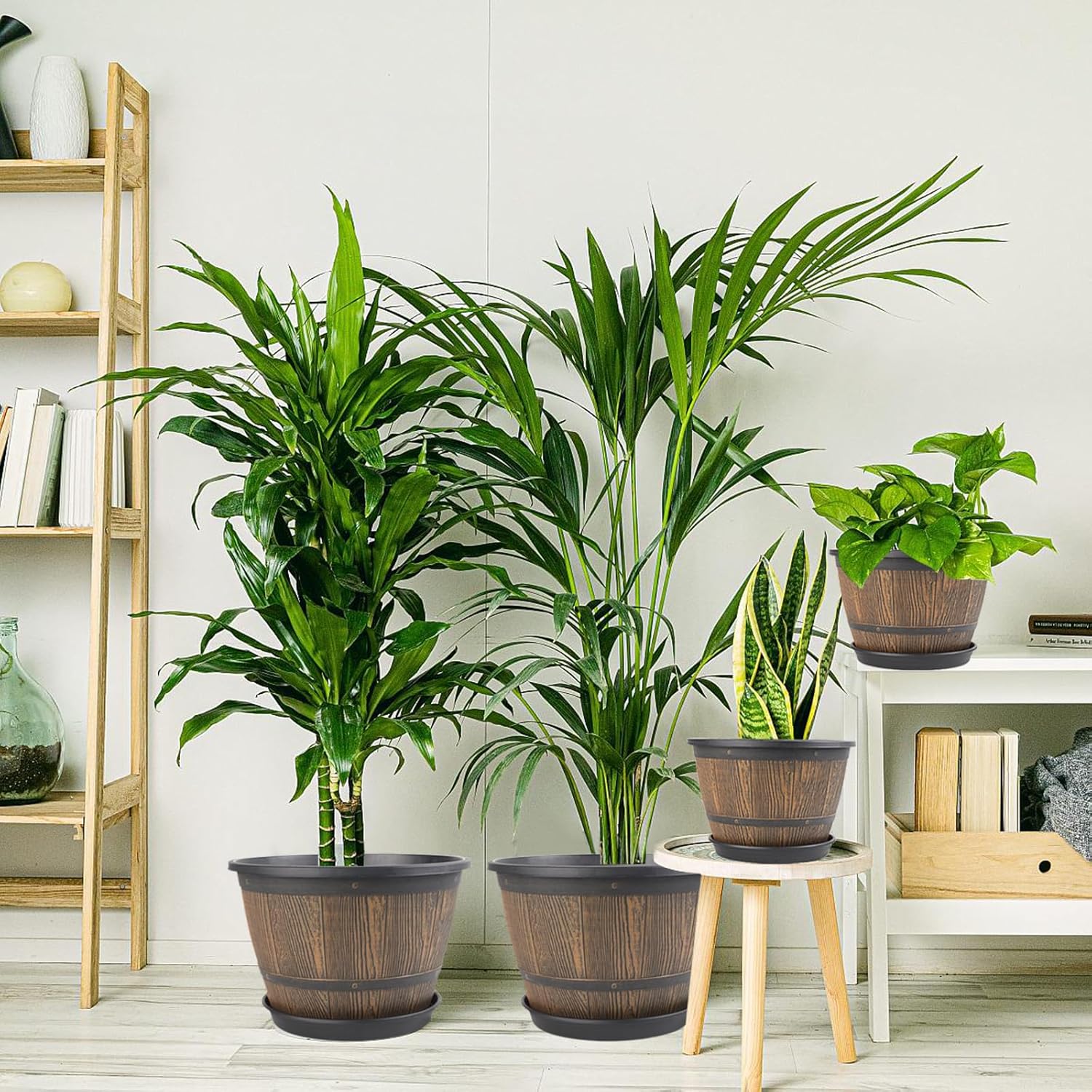 - 【Decorative Planters】Plastic large pots for plants are perfect for indoor outdoor---decorating your living room, kitchen, bedroom, balcony, garden, porch, patio and so on. These whiskey barrel planters outdoor are a must-have for plant lovers. Give your plants a stylish home while bringing your green dreams to life!