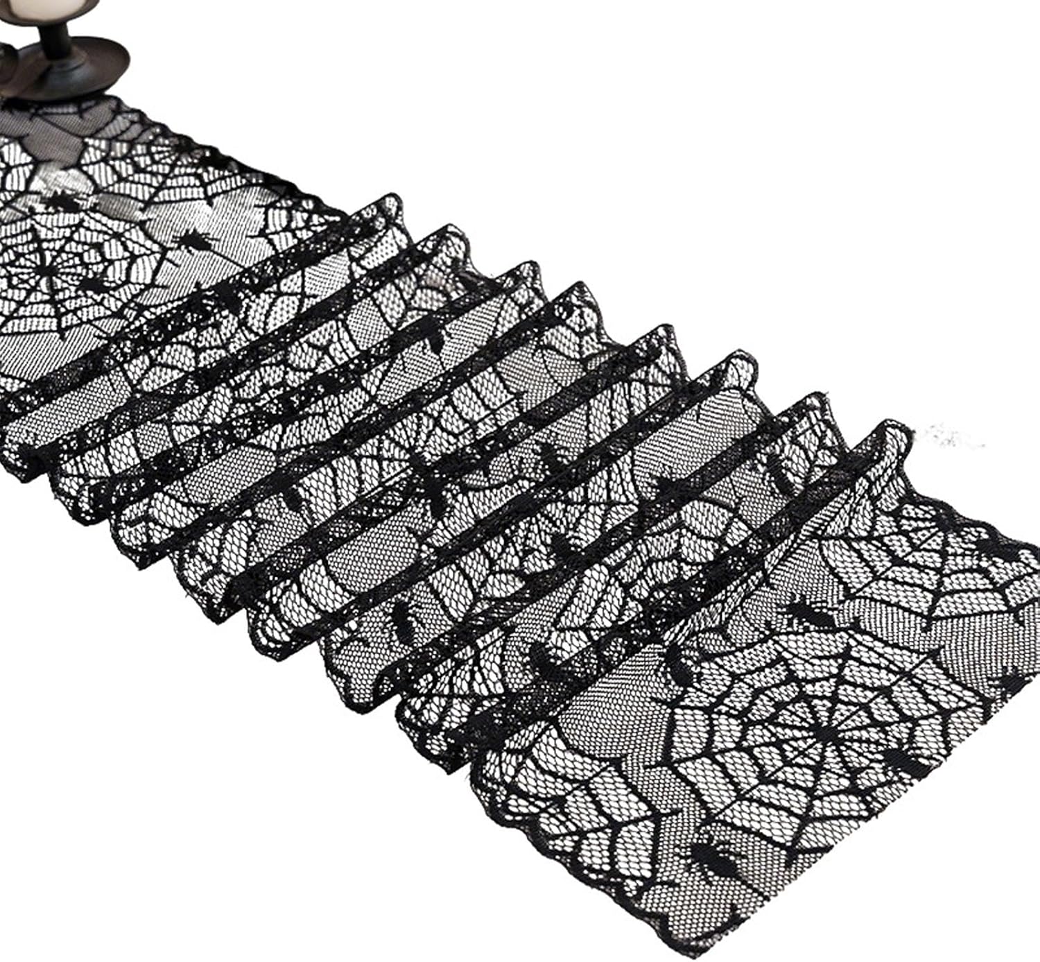Halloween Lace Table Runners Black Gothic Spider and Cobweb Designs Lace Tablecloth Decorations Autumn Indoor Party Tabletop Cove for Halloween Decor Fireplace Mantel Scarf