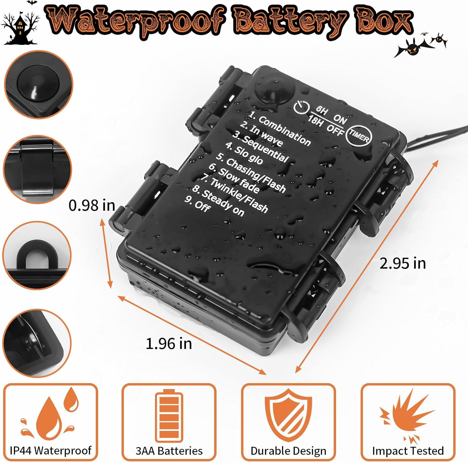 - This 9.9ft orange & purple 30LED light strand features eerie black gauze accents, powered by 3xAA batteries (not included). The battery box includes a button to toggle orange lighting on/off and cycle through 8 dynamic modesâperfect for Gothic, haunted house, or party scenes to meet all your spooky dĂ©cor needs.