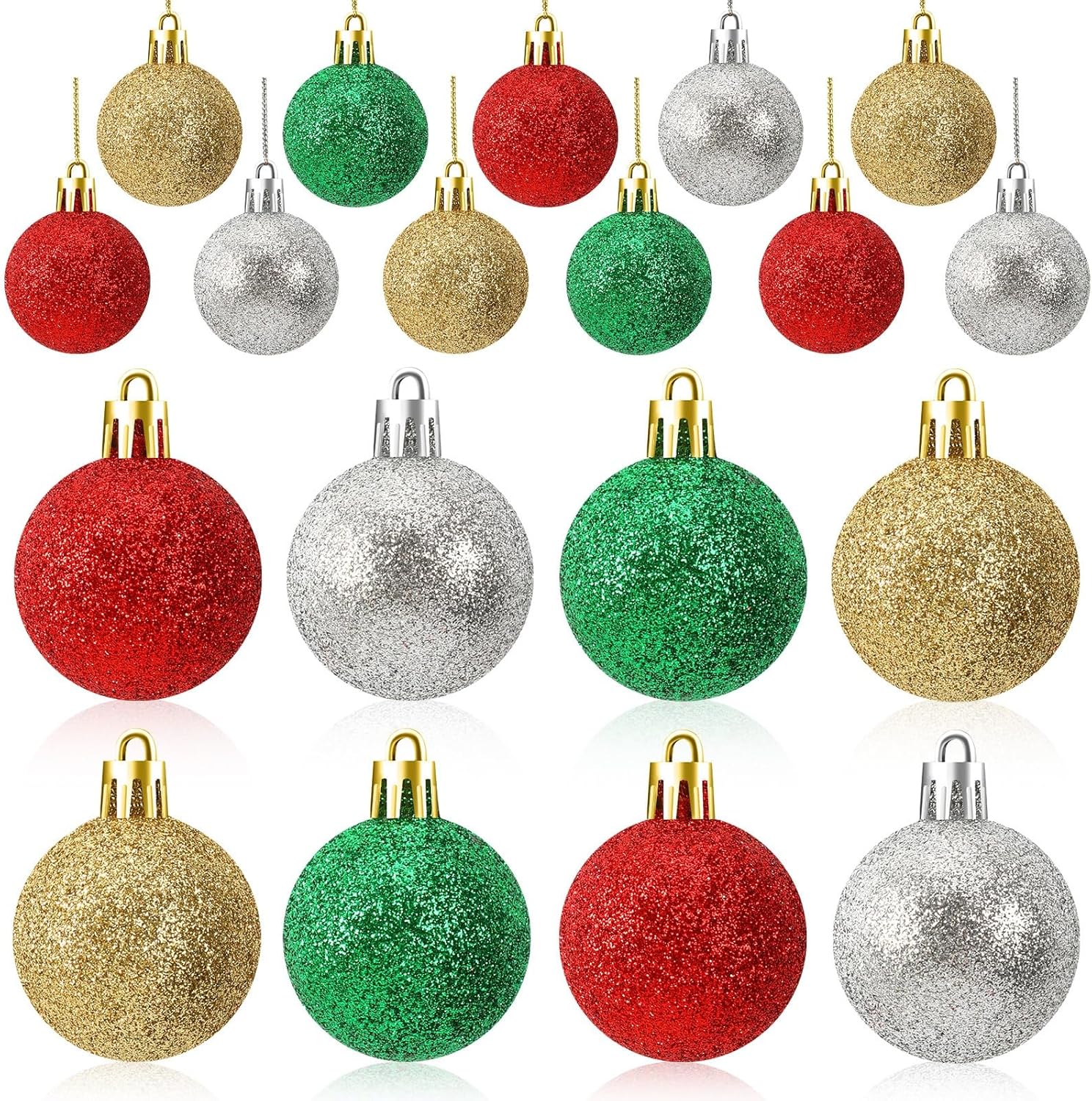 - Sparkling Christmas Balls: Pacakge includes 24 Christmas ball ornaments (1.57 inches x 1.57 inches) in classic red, green, gold, and silver with a glittery finish, ideal for adding shimmer to your Christmas tree decoration