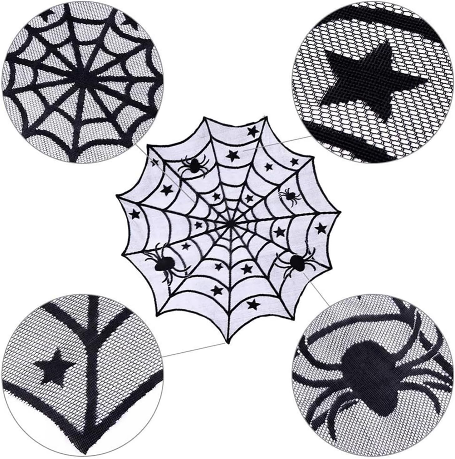 - Unique Design: This round Halloween tablecloth features a classic black color scheme, with an elegant spiderweb pattern in the center, surrounded by stars and spiders, creating a mysterious and fun atmosphere.