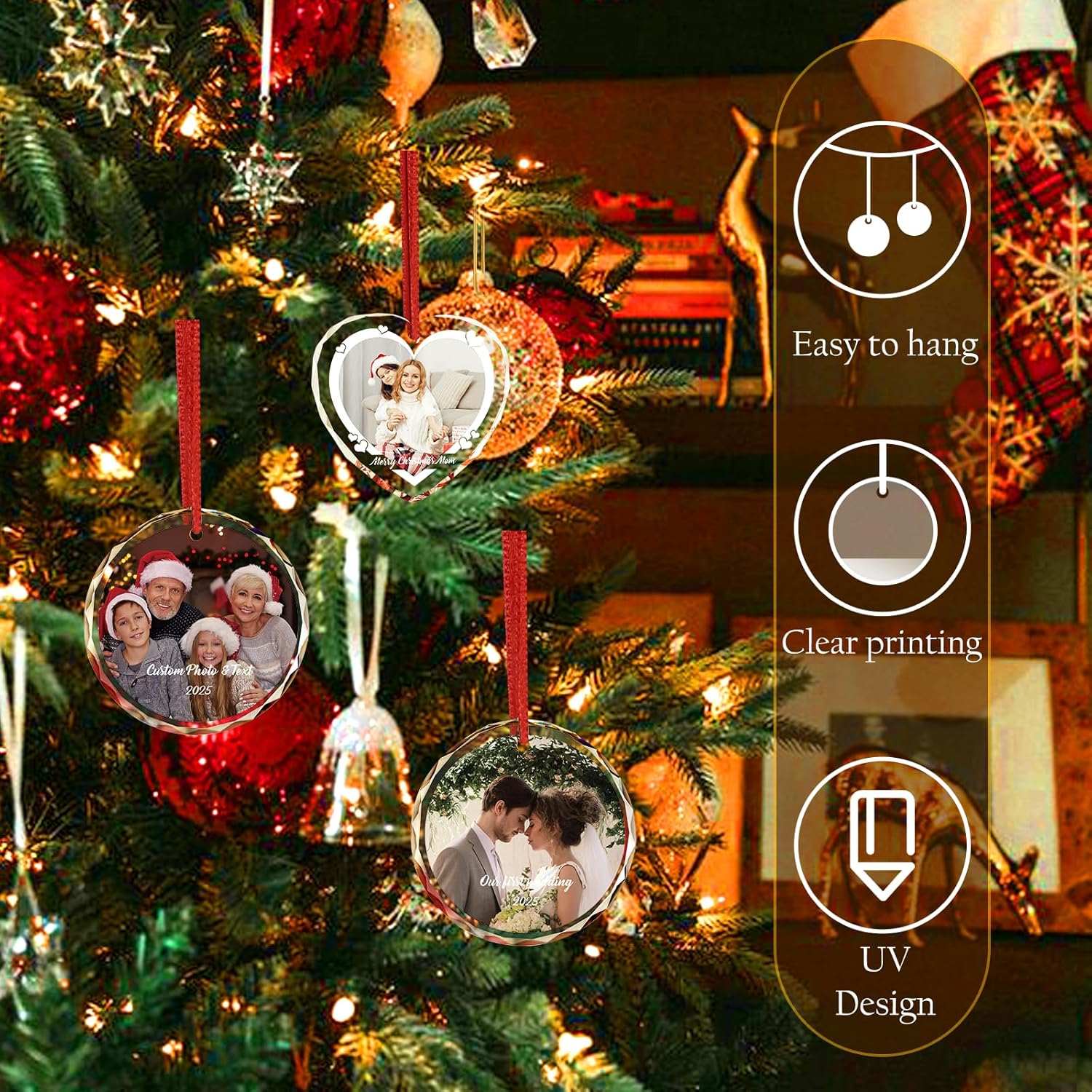- East to Customize: Simply upload your favorite photo, and we'll handle the rest. Each ornament comes with an elegant hanging ribbon, ready to be displayed on your tree and become a cherished holiday tradition