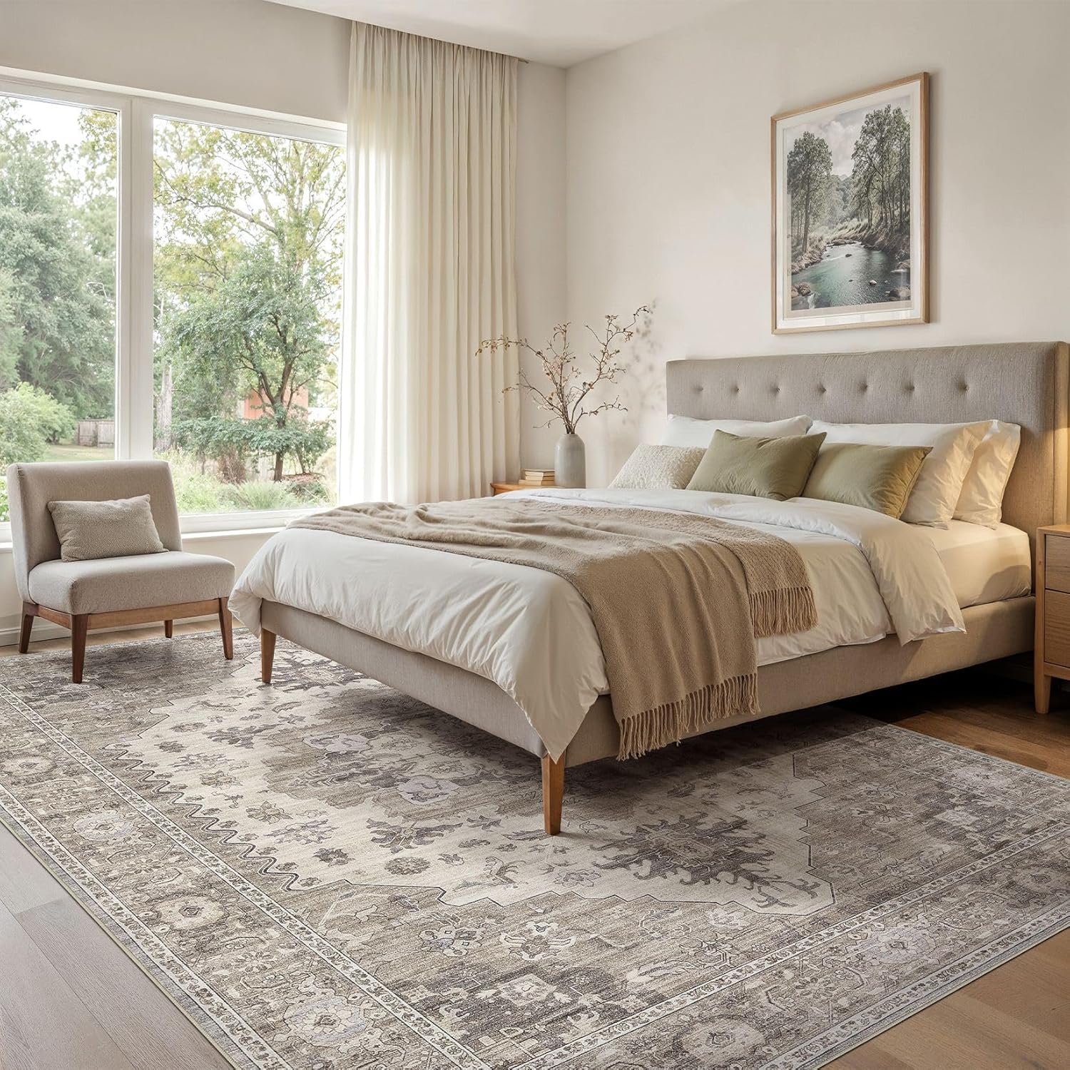 Washable Area Rugs for Living Room -8x10 Neutral Vintage Distressed Floral Farmhouse Boho Large Soft Floor Rug Indoor Non Slip Carpet for Living Room Bedroom Dining Room Office-Brown/Beige
