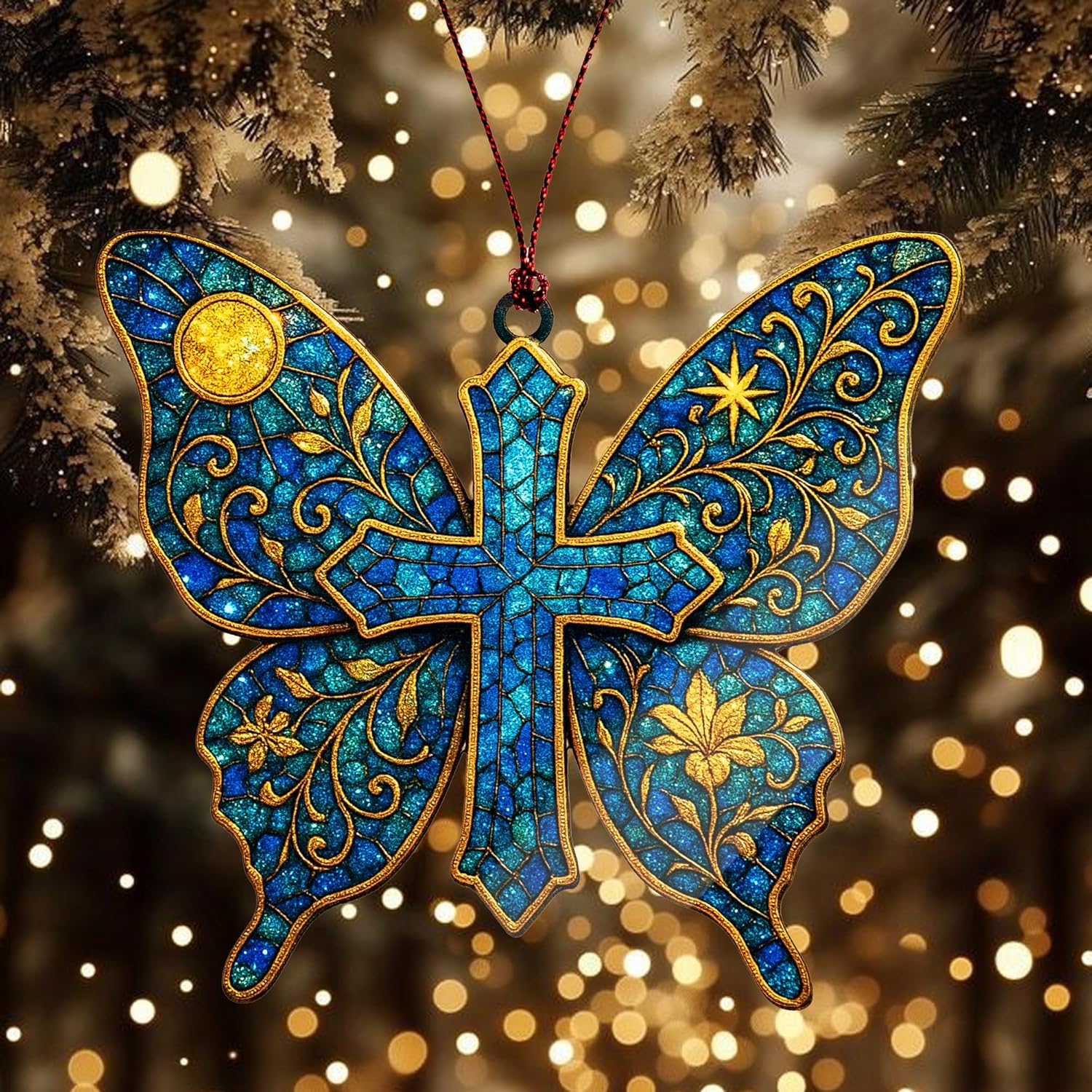 Butterfly Cross Ornament – Christian Memorial Christmas Ornament – Religious Sympathy Gift for Loss of Loved One – Bereavement Keepsake Decoration, Suncatcher Effect stained glass window hanging