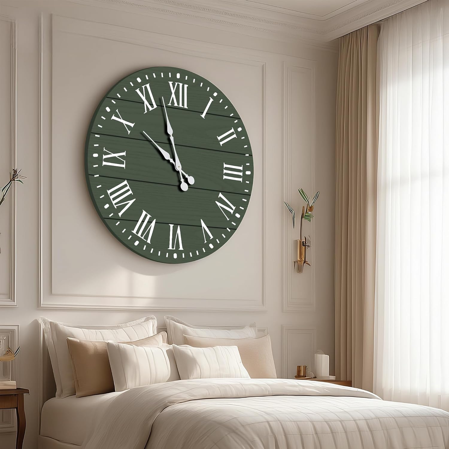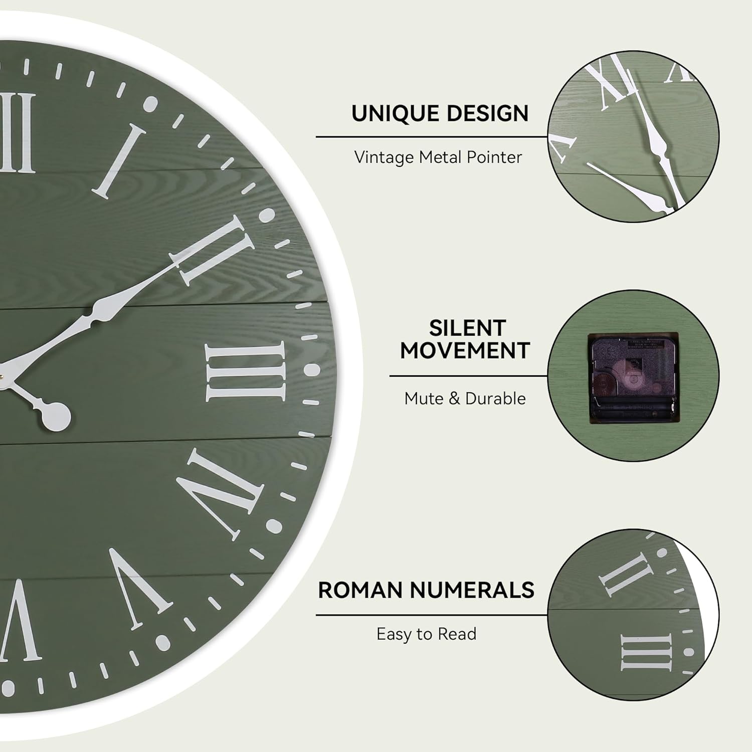 Large Wall Clock with Roman Numeral, 35” Shiplap Wall Clock Farmhouse Nearly Non-Ticking, Round Clock for Living Room Decor, Office, Bedroom, Entrance, Green
